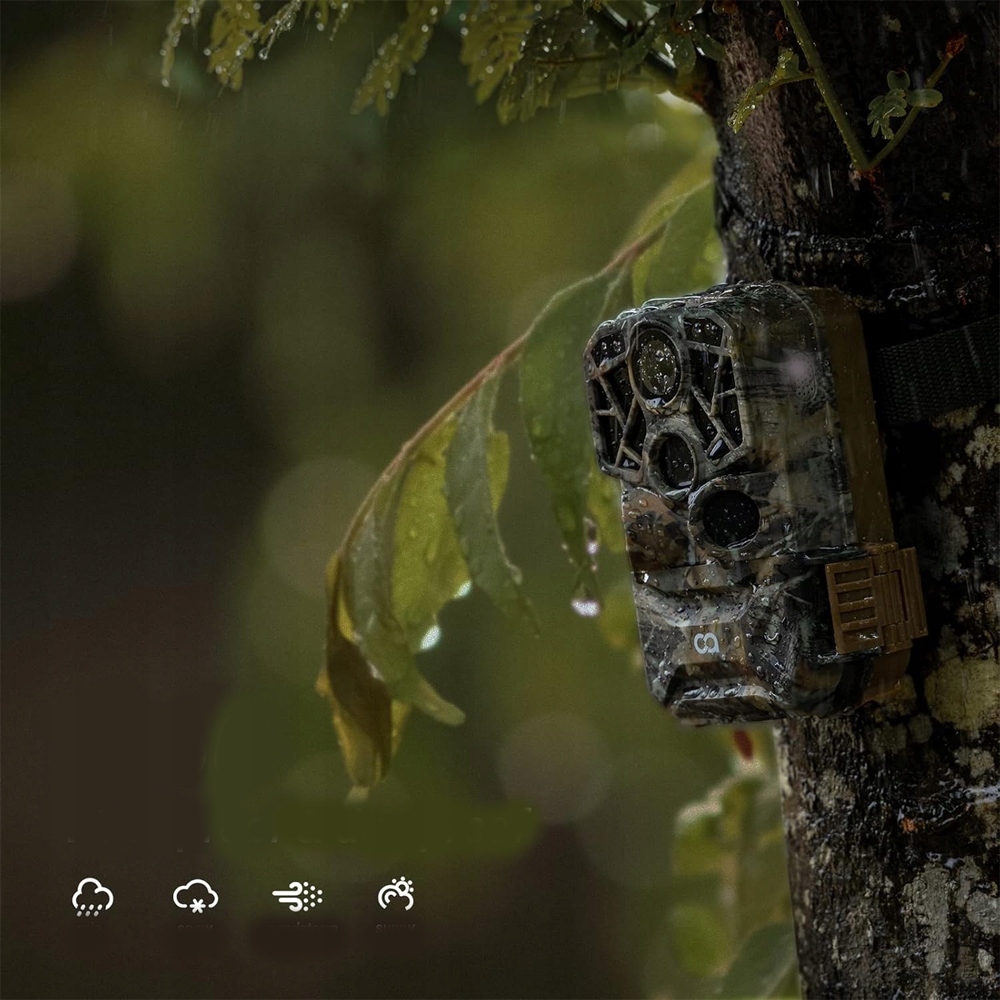 Цю камеру не завадить дощу чи пилу. Його міцний дизайн природно поєднується з навколишнім середовищем, уникаючи виявлення ні тваринами, ні людьми.