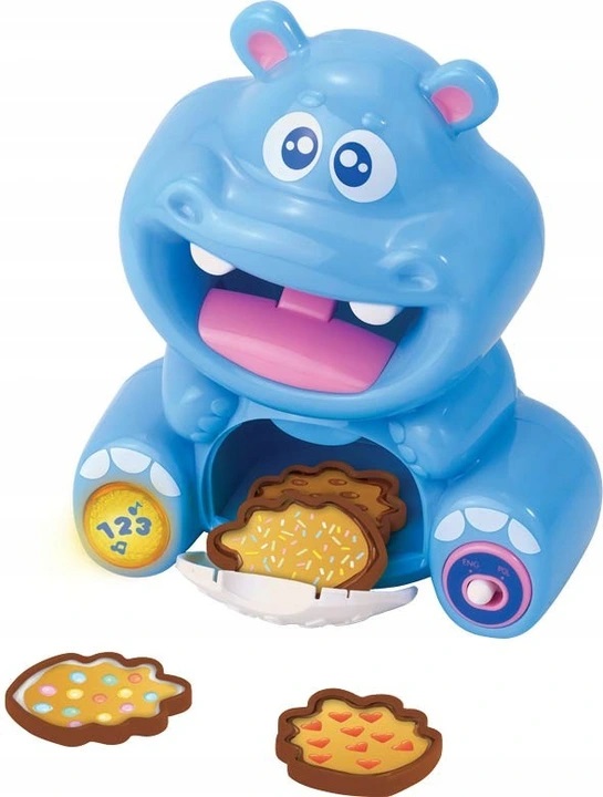Двомовний Бегемот(польська/англійська) рахує різнокольорове печиво та жадібно його їсть.