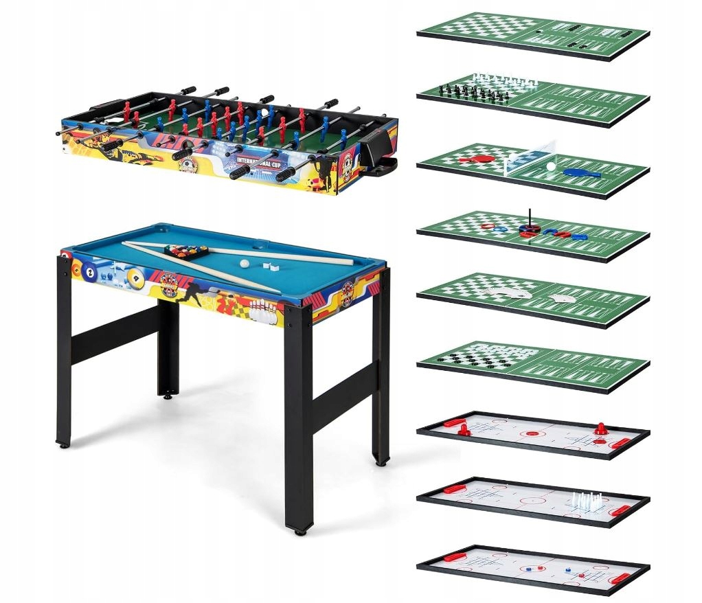 Завдяки вражаючому вибору з 12 захоплюючих ігор, включаючи настільний футбол, хокей, більярд, настільний теніс, боулінг, шаффлборд, шахи, нарди, ферзь, покер з кубиками, кидок кільця та підкову, цей ігровий стіл є найкращим джерелом нескінченних розваг і емоції. Крім того, наш багатоігровий стіл підходить для різноманітних умов, будь то затишний будинок, жвавий паб або навіть офіс чи вітальня. Тепер ви можете розраховувати на радість і розваги щодня. Але на цьому функції не закінчуються. Наш ігровий стіл оснащено розумною функцією штабелювання, яка дає змогу економити цінний простір, зручно складаючи всі стільниці, коли вони не використовуються.