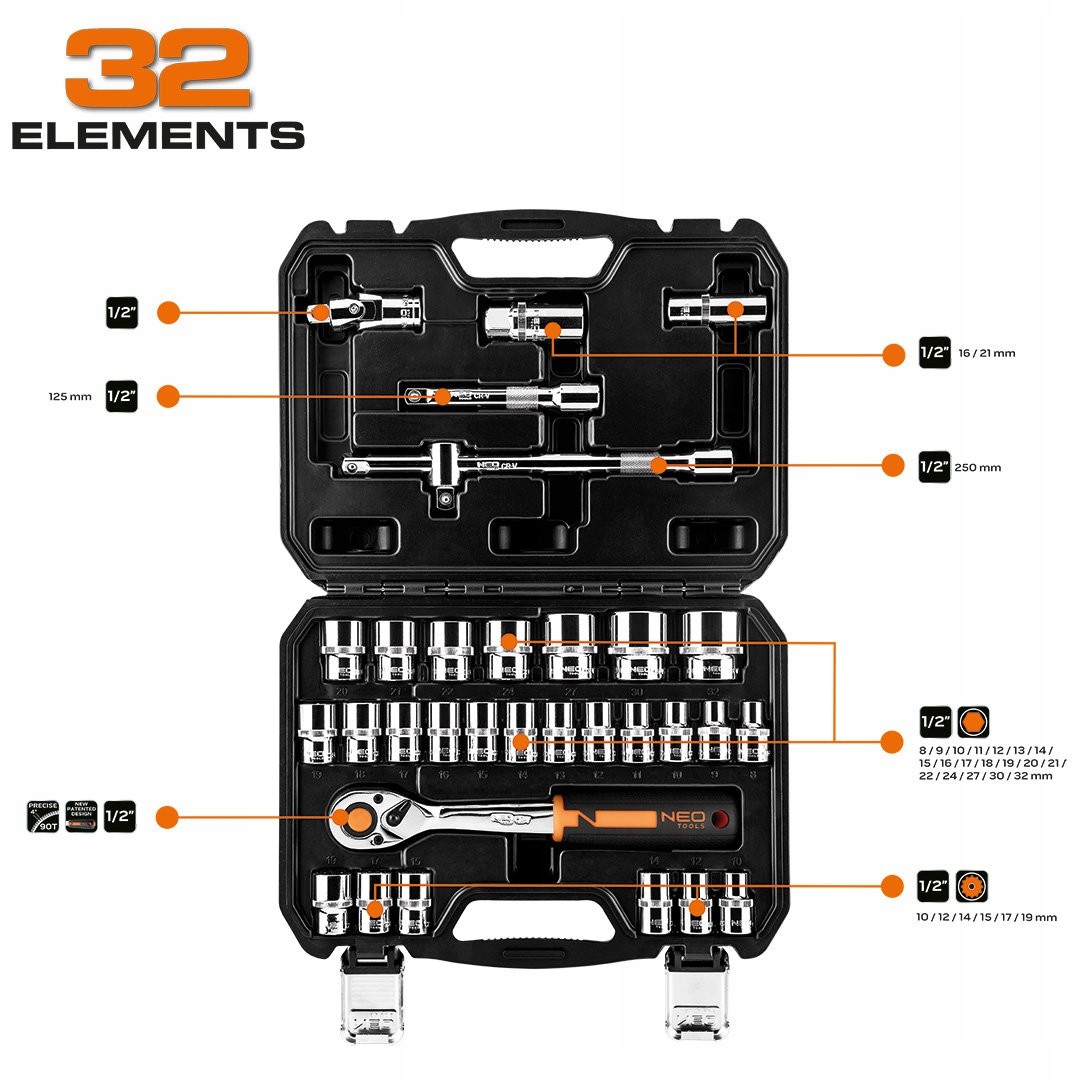 Ключі торцеві ½", набір 32 предмета, CRV, 10-038 NEO - це високоякісний набір із 32 виробів, який представлений у зручному пластиковому кейсі. У набір входять такі інструменти та аксесуари:
