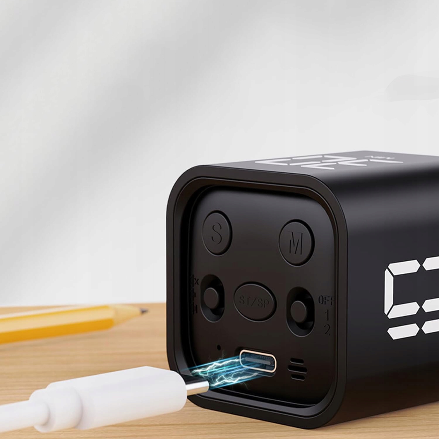 - Таймер зручно тримати в руці, портативний і поміщається в кишеню. Він перезаряджається, оснащений портом швидкої зарядки USB-C і вбудованим акумулятором на 500 мАг.