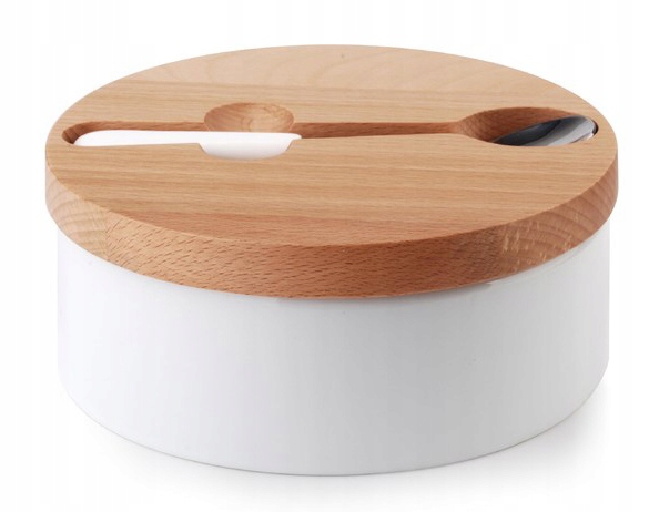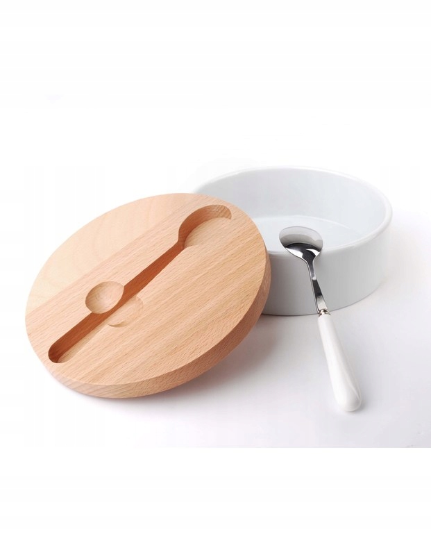Порцелянова цукорниця простої сучасної форми в поєднанні з бамбуковою кришкою з ложечкою для цукру всередині.