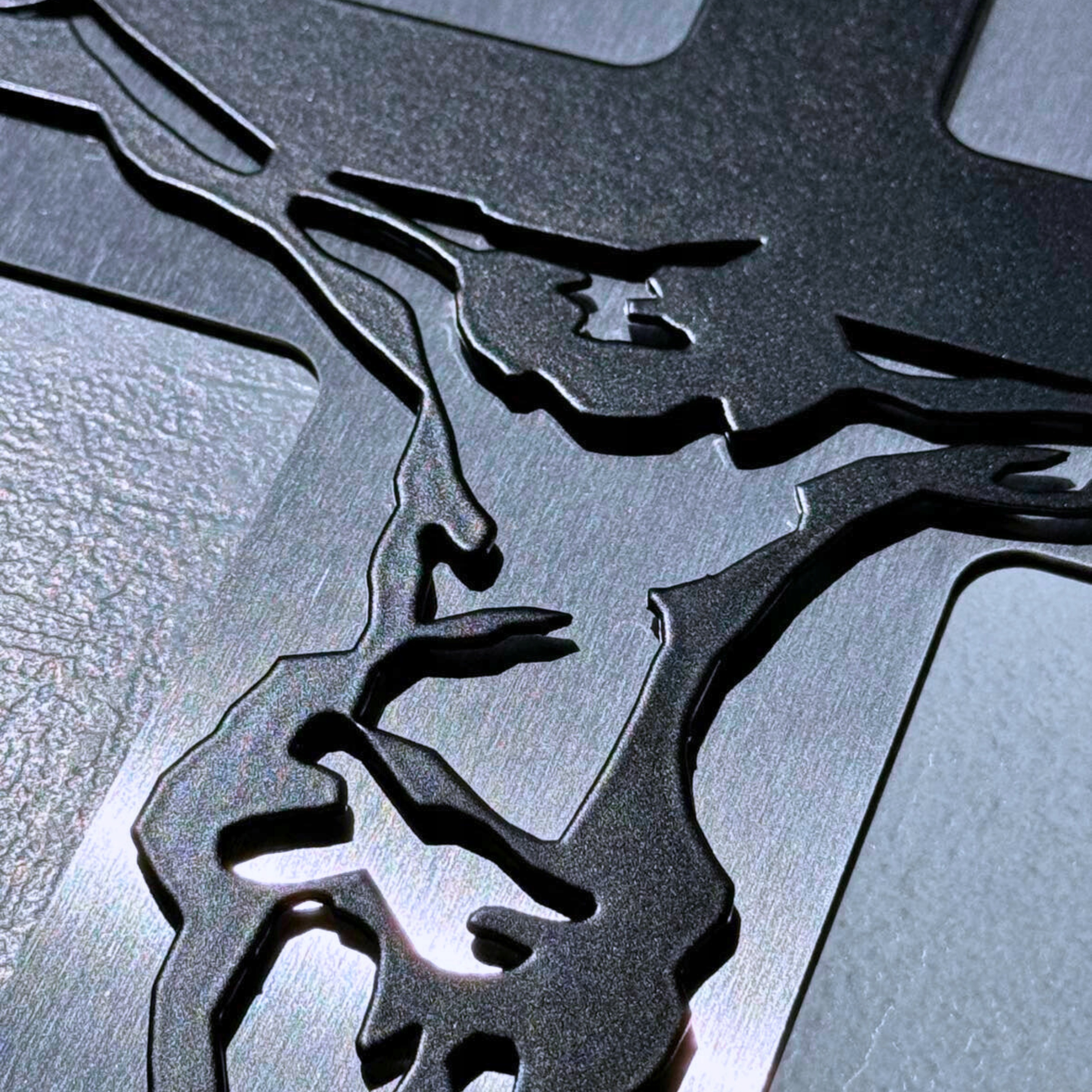 Відтінок чорного хреста отримано шляхом порошкового фарбування, а другий хрест виготовлено з матової нержавіючої сталі, з’єднаної тонкими гвинтами.