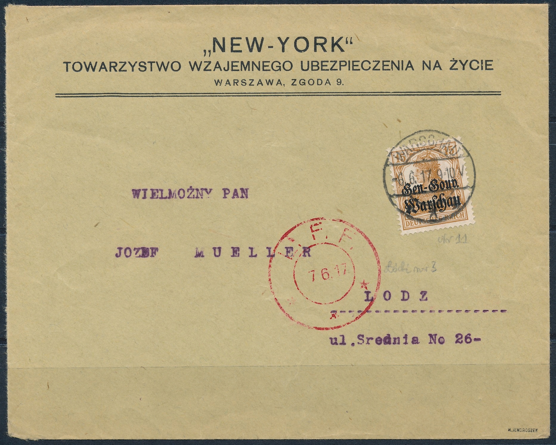 Муніципальний човен місцевого самоврядування Poczta 1917.vi.06. Компанія поштова пошта, що надсилається з Варшави, сплачена з штампом GGW з номіналом 15 Pfennigs, доставлених на адресу пожежною охороною в Лодзі, яка за її послуги стягувала відповідну плату, додаючи свою доставку "L.F.F. 7.6.17". у червоному кольорі !!!