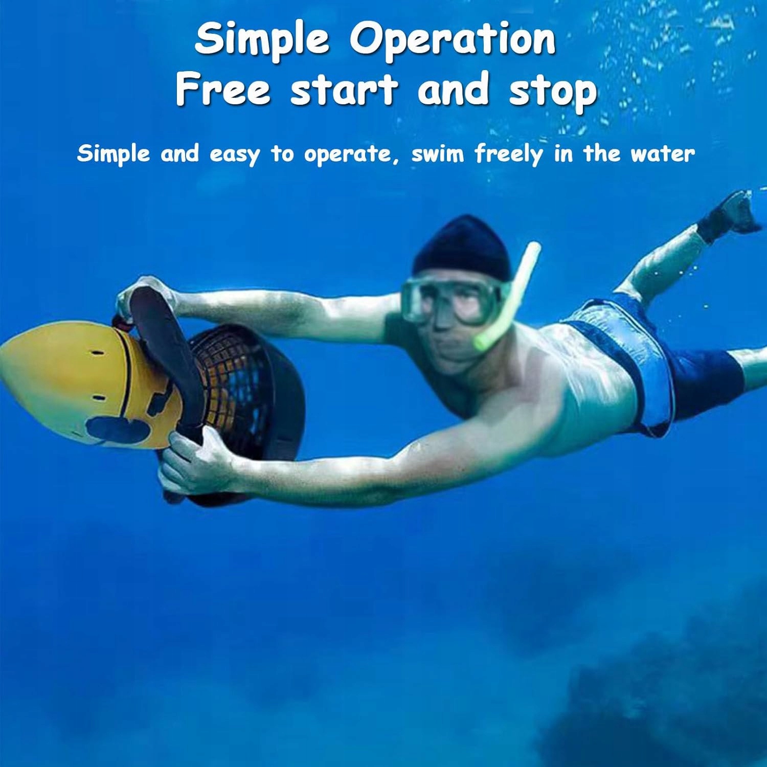 Електричний дайвінг -скутер повністю живиться від батарей і має 2 швидкості. Використовуючи комутатори з обох боків ручки, натисніть і утримуйте один перемикач, щоб запустити швидкість, утримуючи другий перемикач для прискорення, відпустіть, щоб зупинити прискорення.