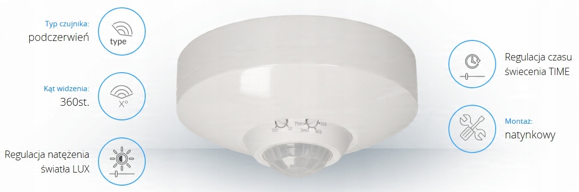 Поверхневий датчик використовується для автоматичного керування освітленням або іншими електричними пристроями всередині будівлі. Датчики з кутом огляду: 360 градусів, потенціометри для регулювання: часу освітлення та чутливості до інтенсивності світла. Датчик працює зі світлодіодним освітленням.