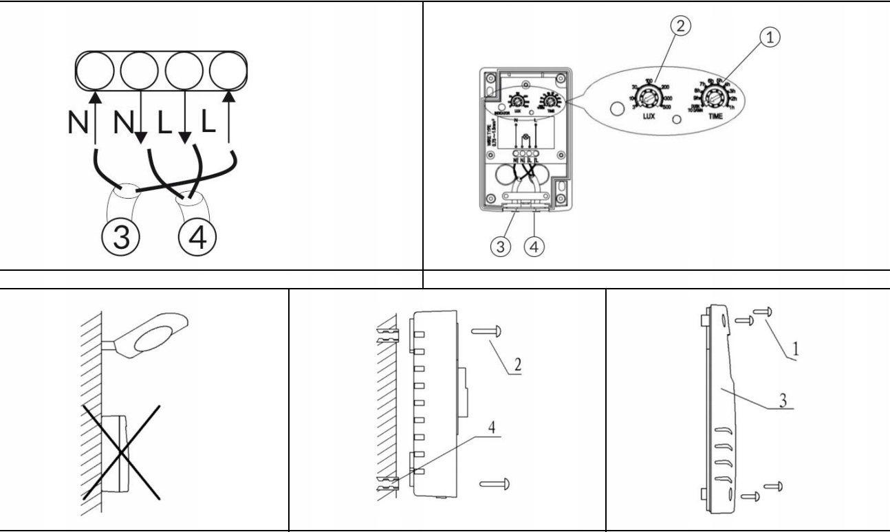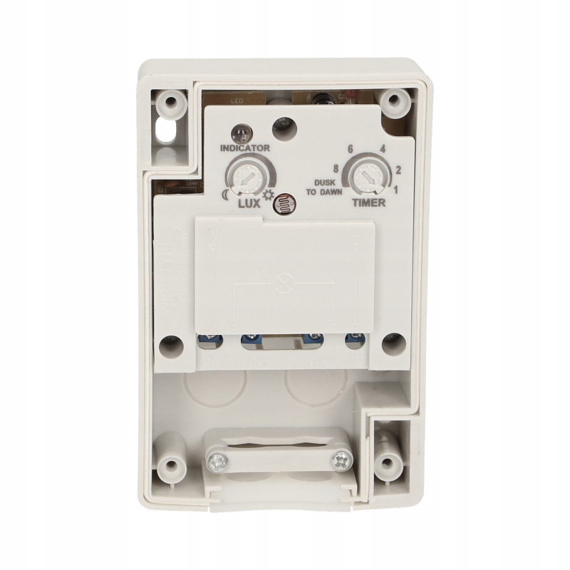 - Рівень інтенсивності освітлення, при якому датчик має вмикати освітлення, встановлюється за допомогою потенціометра LUX. Налаштування слід проводити вдень, коли денне освітлення найсильніше. Поверніть ручку проти годинникової стрілки до мінімального положення, потім повільно повертайте її за годинниковою стрілкою, доки не загориться світлодіод. Освітлення ввімкнеться протягом 60 секунд після того, як увімкнеться світлодіод.