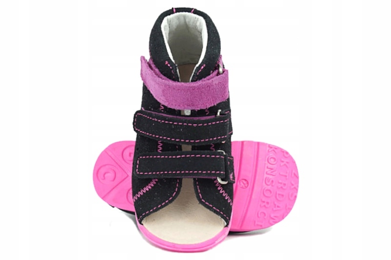 Дизайн представленого взуття дозволяє належним чином розробити стопу дитини. Жорсткі підбори та витягнуті бічні закладки підтримують стабілізацію стопи під час ходьби. Взуття має сертифікат медичного продукту - CE.