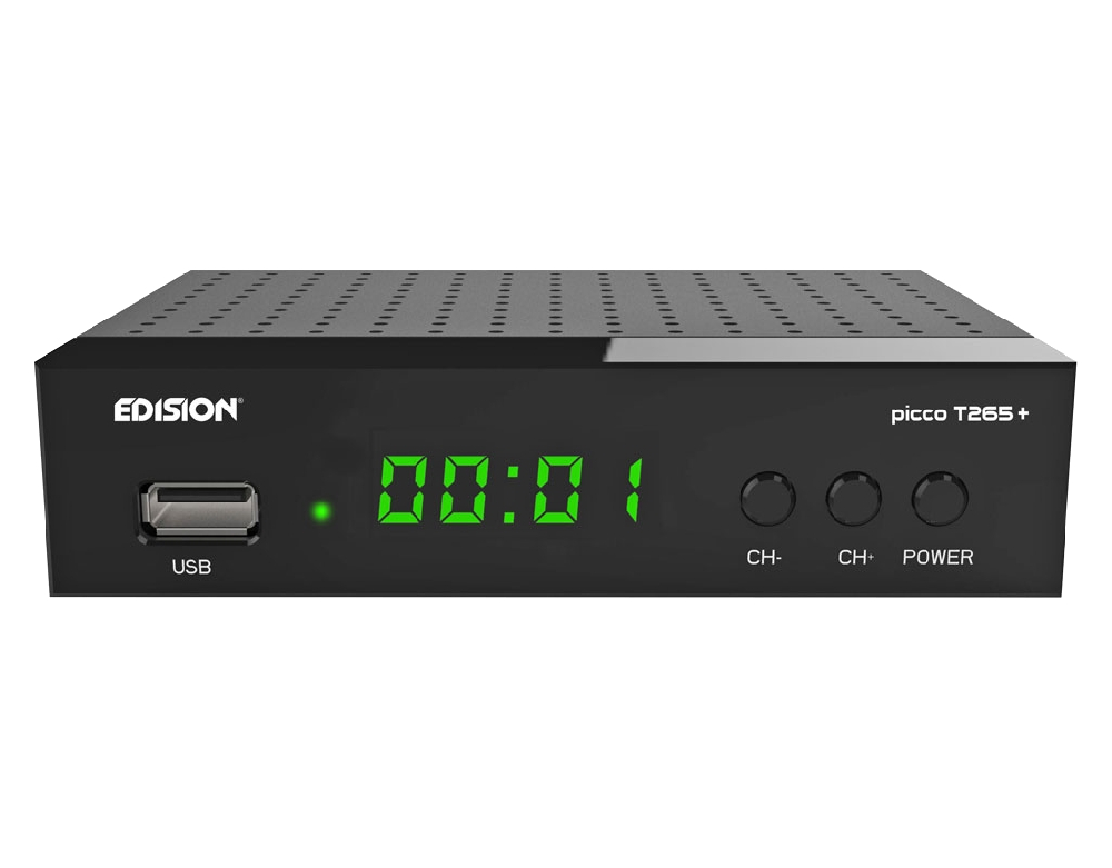PICCO T265+ — тюнер для прийому ефірного та кабельного сигналу в якості Full HD, гібрид DVB-T2/C головка з новим 10-бітним стисненням H.265/HEVC. Динамічно розроблений приймач цифрового ефірного та кабельного телебачення PICCO T265+ підтримує USB-адаптери Wi-Fi для доступу до таких програм, як YouTube, Погода. Ресивер також має функції мультимедійного плеєра з підтримкою звуку Dolby Digital. PICCO T265+ супроводжується ергономічним пультом дистанційного керування 2-в-1 для керування приймачем, а також готовим і запрограмованим 4 найважливішими функціями для телевізорів SAMSUNG і LG. Ви можете запрограмувати будь-які 4 кнопки для кожного телевізора. Легкий для читання 4-значний світлодіодний дисплей, кнопки ввімкнення/вимкнення та каналу +/- на передній панелі покращують загальний досвід користувача. Завдяки цим покращеним функціям EDISION стане вашим вірним телевізійним супутником.