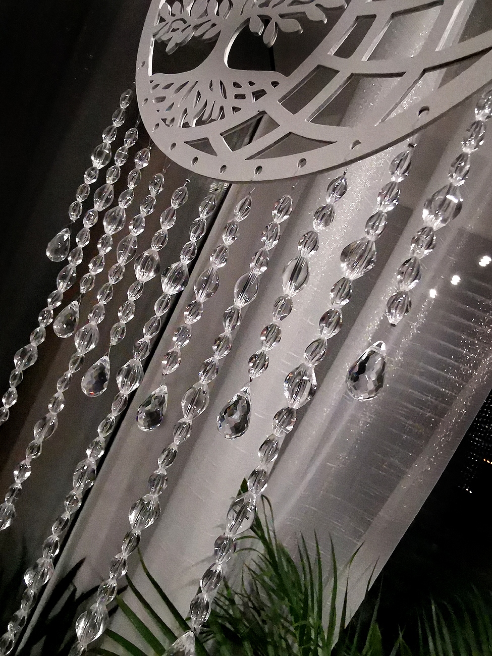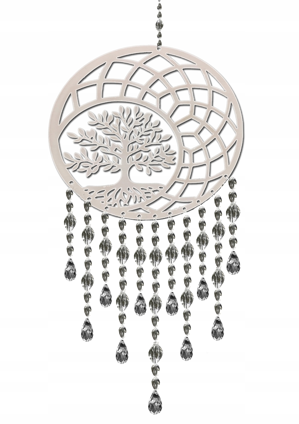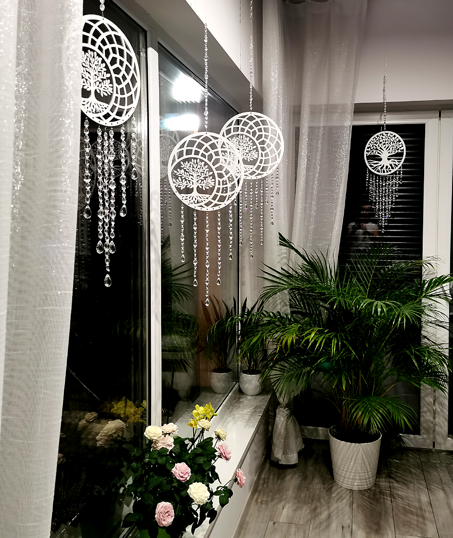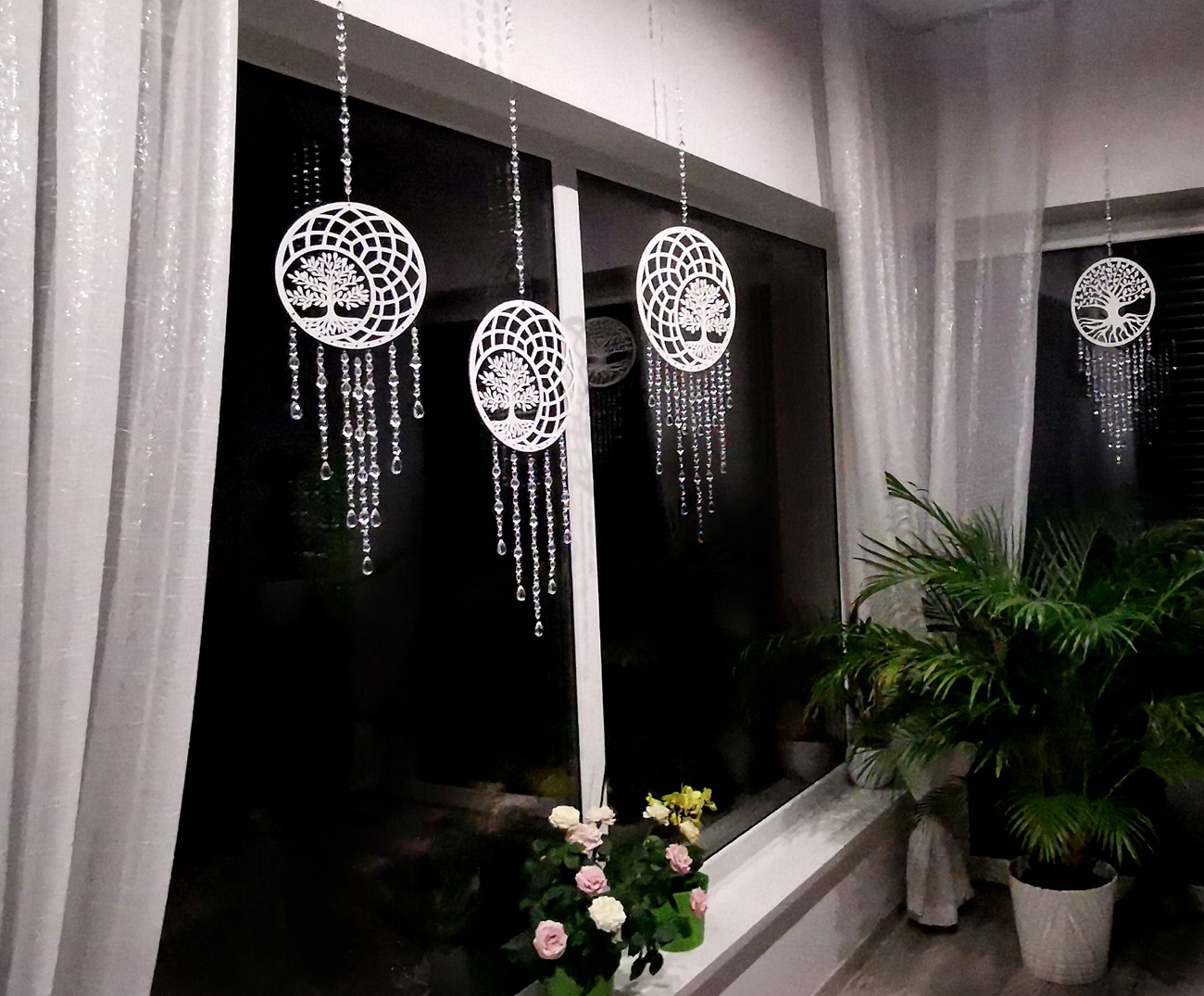 Уловлювач виготовлений з фанери 3 мм. Колір білий, матовий. Можливе видиме зерно натуральної деревини. Розмір дерев'яного обруча 30 см. Мандала прикрашена акриловими кристалами.