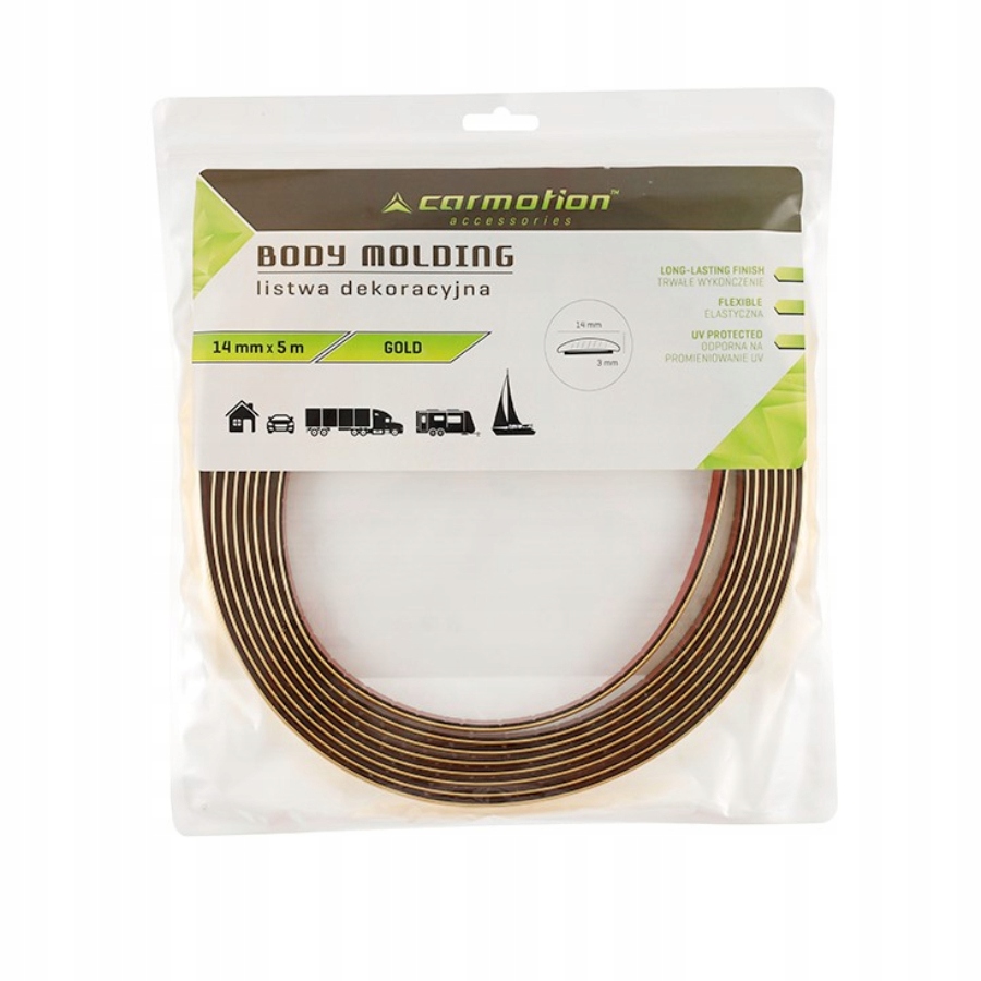 Декоративна планка з гнучкого ПВХ матеріалу, покрита золотим кольором. Призначений для декорування салону (панель приладів) або екстер'єру автомобіля (двері, бампери). Гнучкий і стійкий до погодних умов. Дуже простий у встановленні, він має міцну самоклеючу стрічку, тому ви можете встановити його без необхідності використовувати інструменти.