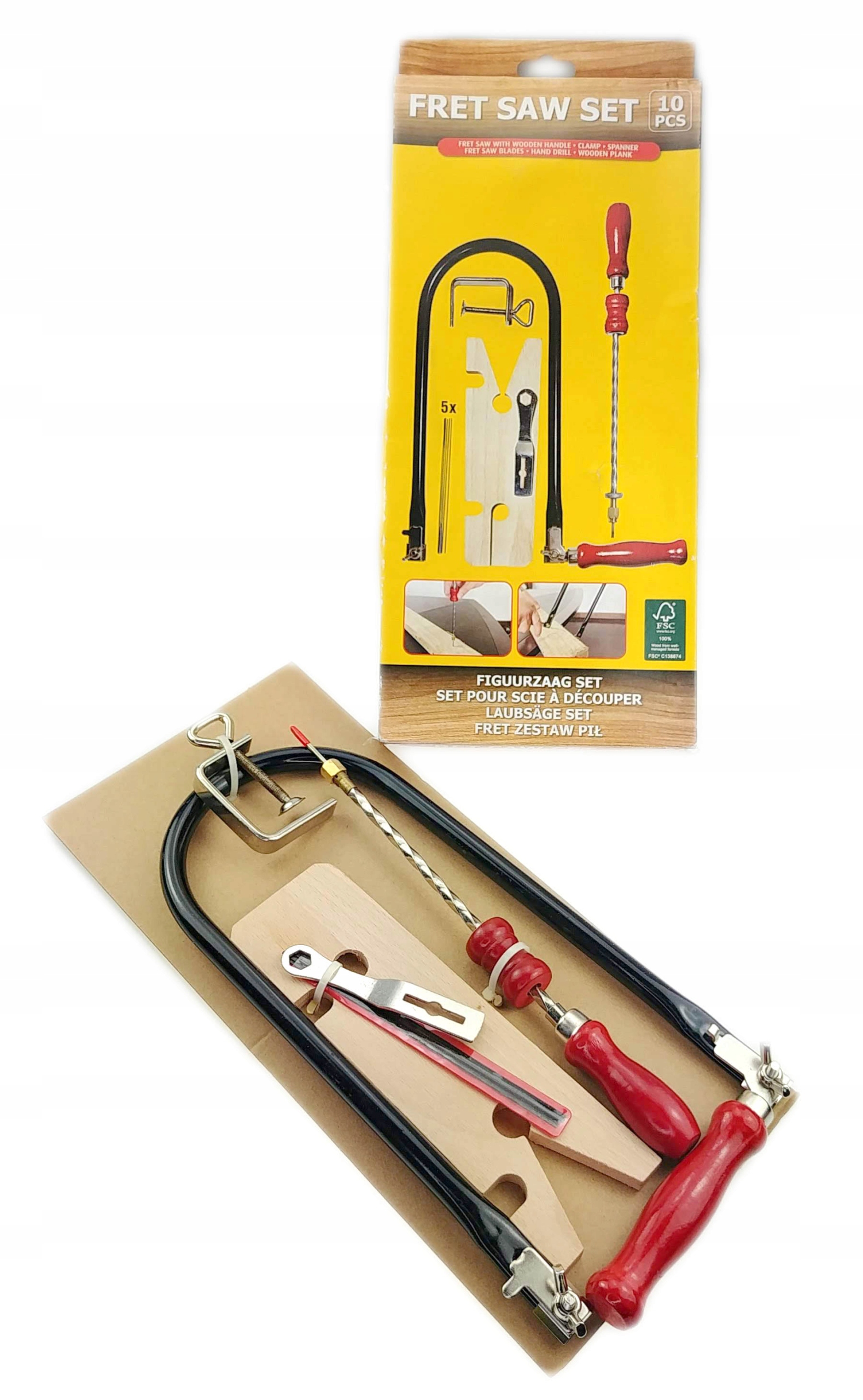 - набір включає: 1 x волосяна пила (лобзик) з дерев’яною ручкою (висота пилки 33 см), 1 x металевий затискач, 1 x дерев’яна шайба/дошка, 1 x гайковий ключ для тримача/лобзика, ручна дриль / свердло 28 см зі свердлом, 5 пилок / полотен для лобзика довжиною 15 см,