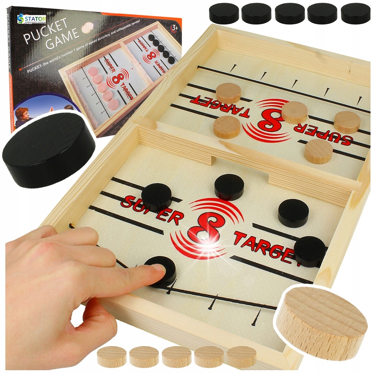 Класичний дерев'яний хокей - Ідеальна розвага для дітей і дорослих! У набір входить 5 шайб для кожного гравця. Закидайте шайби крізь отвір на дошці та першим перемістіть їх на бік суперника! Гарна розвага та емоції гарантовані. Ідеально підходить для сімейних вечорів і зустрічей з друзями!