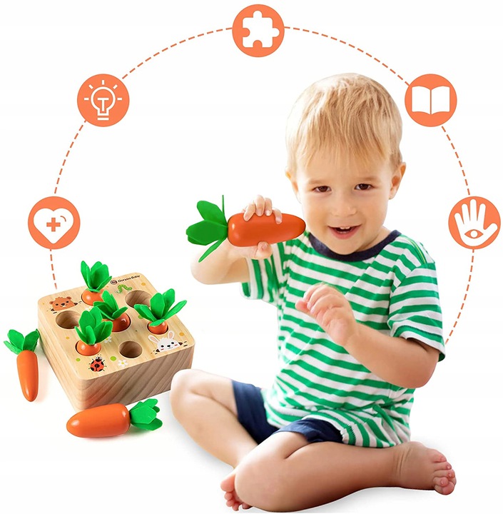 - Іграшки для збирання моркви — це хороші іграшки, які допомагають дітям розвивати моторику та мислення. Це хороша іграшка для дітей 1-3 років, щоб зрозуміти форму і колір моркви. Іграшки-моркви Монтессорі Покладіть морквини в різні отвори відповідно до розміру морквини, щоб навчити дитину досліджувати речі та розпізнавати розмір кімнати.