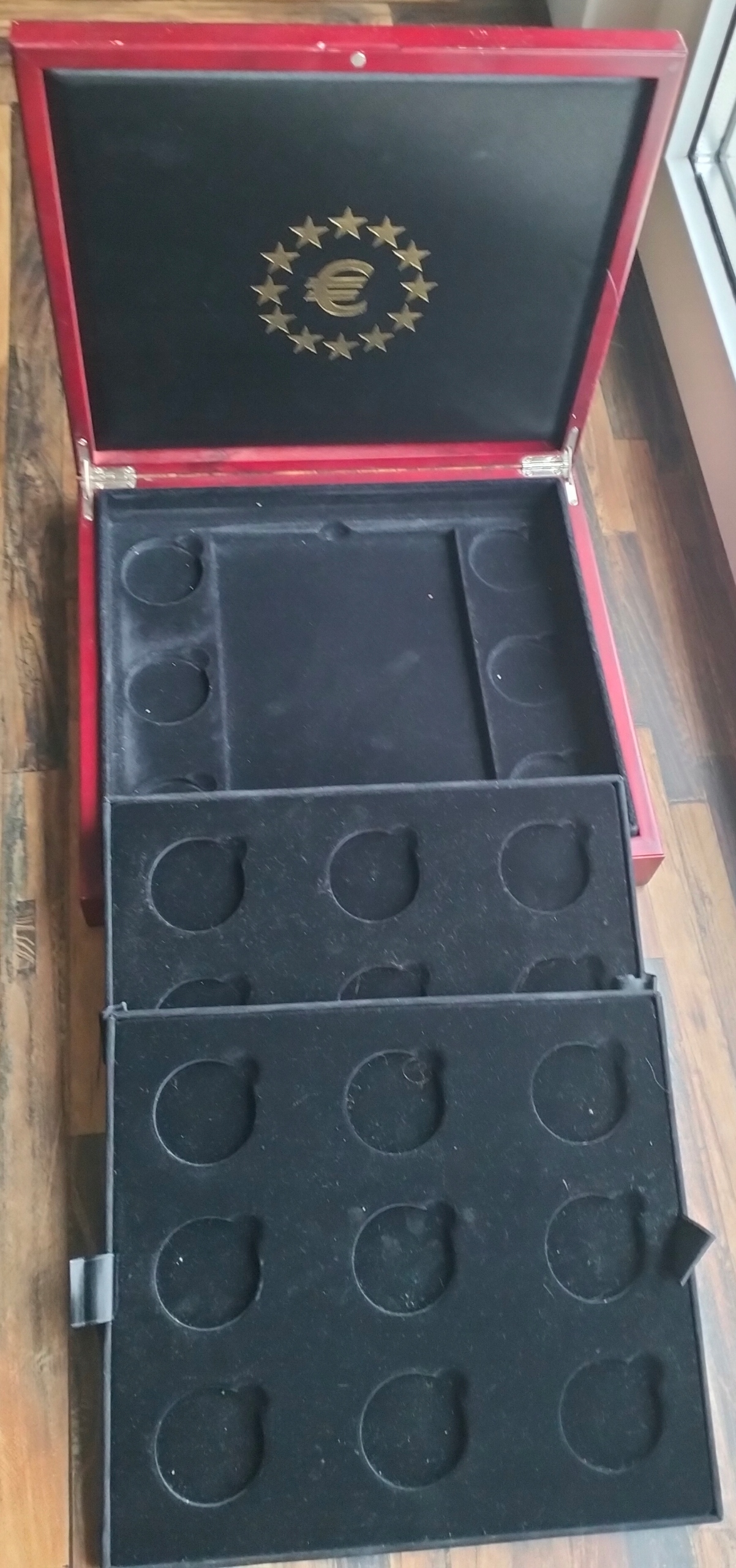 ДЕРЕВ'ЯНА КАСЕТА НА 21 ШТ. - МЕДАЛІ ЗА МОНЕТИ ЄВРОПИ