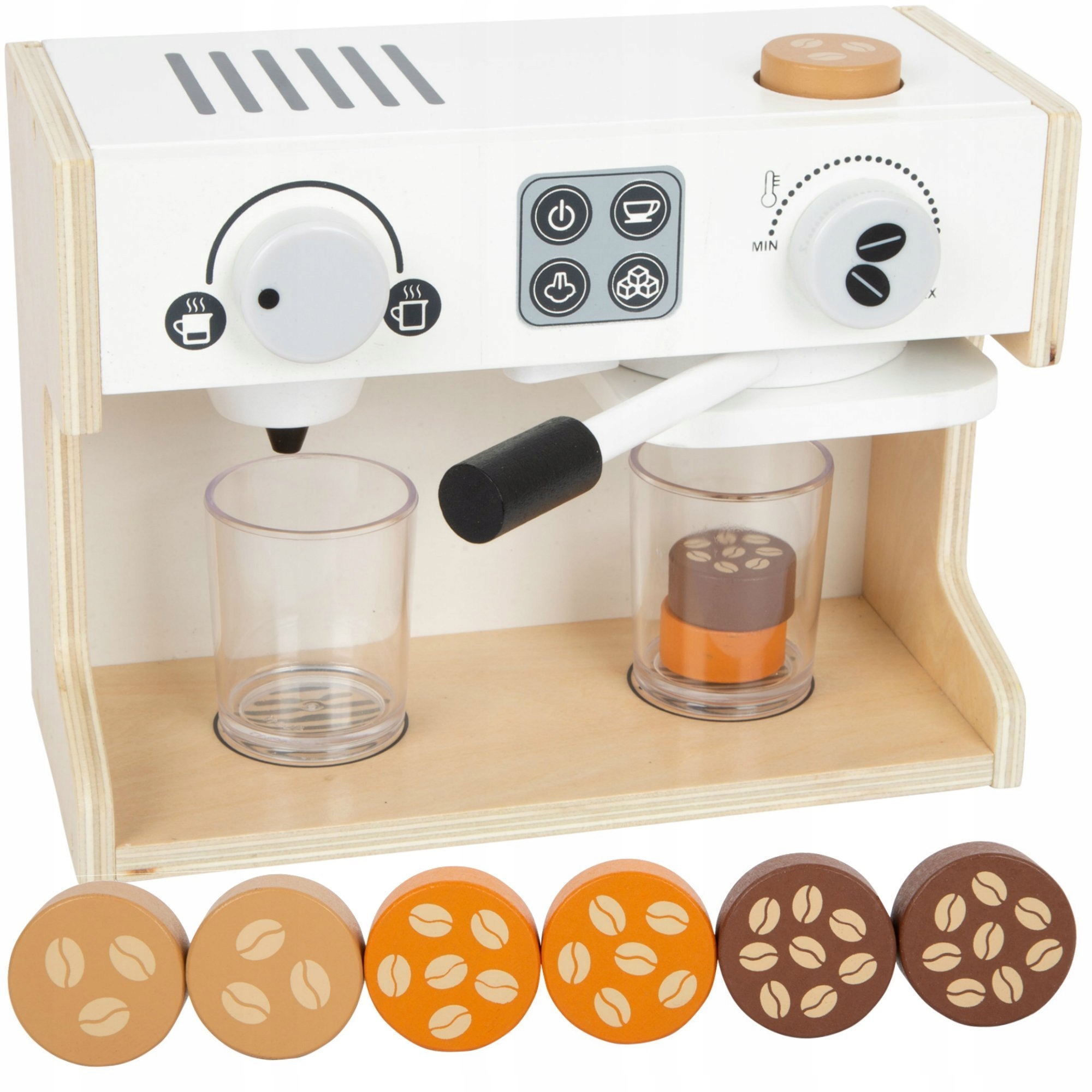 Кавоварка з дерева – чудова іграшка для дітей. Відтепер діти можуть наслідувати своїх батьків і готувати їм порцію ранкової кави. Кавомашина була зроблена з акцентом на реалістичні деталі, такі як обертові ручки, які видають клацаючий звук, або ручка колби, яка дозволяє «каві» падати в келихи. Кава представлена у вигляді круглих дисків з різними відтінками коричневого кольору, тобто різної «міцності» напою. На задній панелі машини є список видів кави, які може приготувати маленький бариста.
