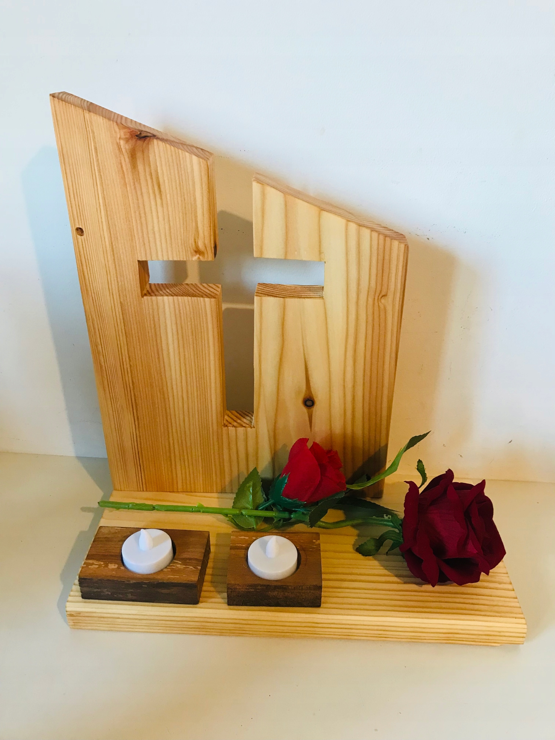 Немає сумніву, що дерев'яний хрестз вогнями та трояндою в одному є цікавою композицією.