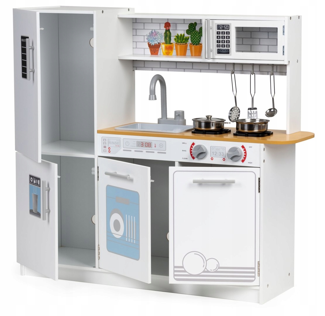 для майбутніх скриньок, що імітують дорослих, завдяки цій кухні ваша дитина матиме можливість відігравати роль шашки. Утилізація шеф -кухаря включає, серед інших пальники з обертовими ручками , щоб встановити відповідну температуру. Під стільницею є духовка і посудомийна машина. Шафи