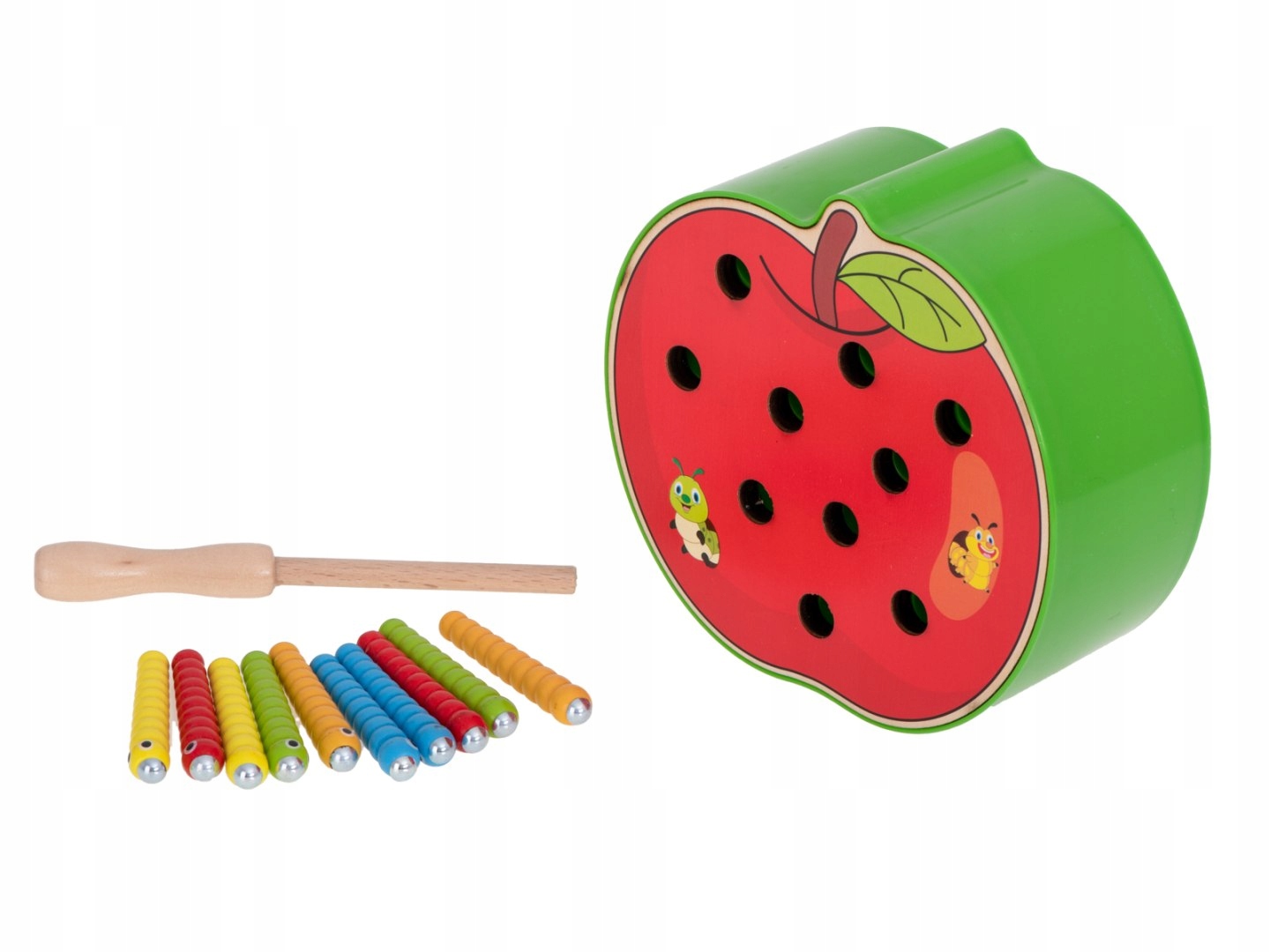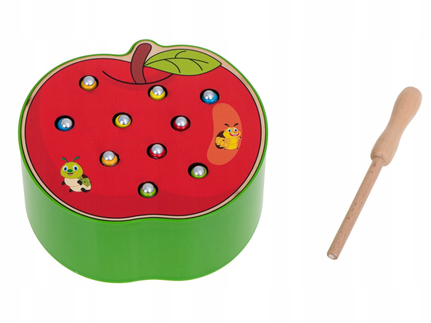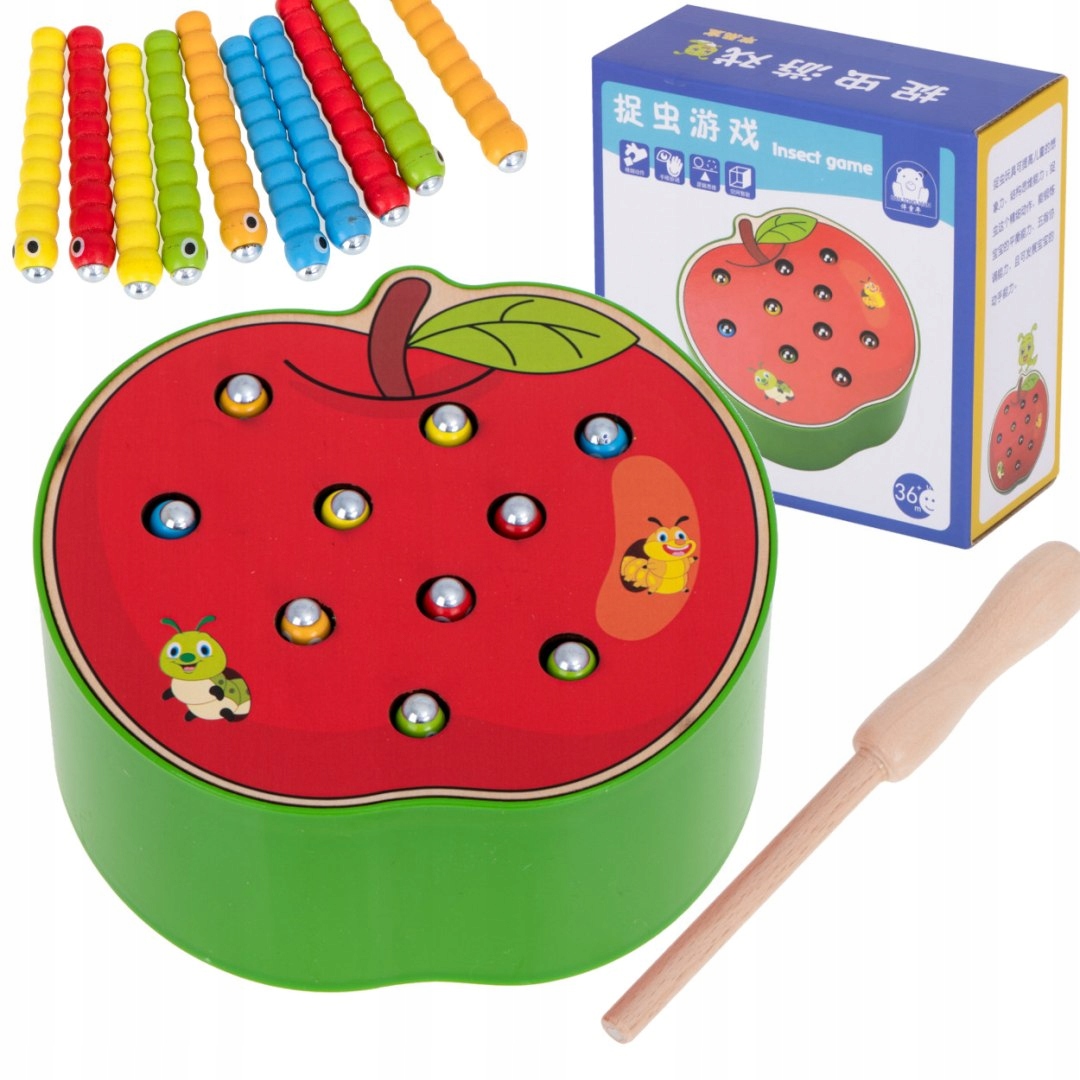 У набір входить основа у формі яблука з 10 різнокольоровими гусеницями з дерева та металу та дерев'яна паличка з магнітом на кінець. p>