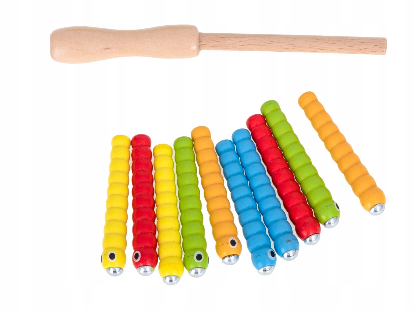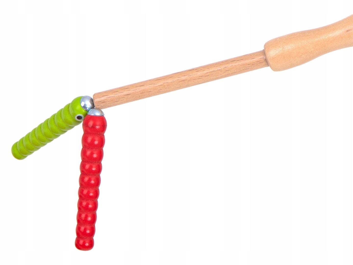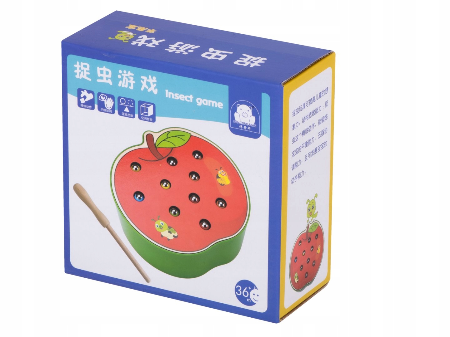 У набір входить основа у формі яблука з 10 різнокольоровими гусеницями з дерева та металу та дерев'яна паличка з магнітом на кінець. p>