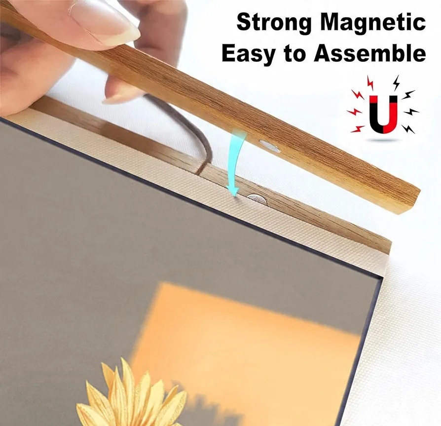 - Сильні магніти. Кожен набір магнітних вішалок для плакатів включає 4 шматки дерев’яних смужок із сильними магнітами для утримання всіх видів пласких плакатів на поверхнях, картинах, фотографіях і творах мистецтва. Примітка. Велика товщина плаката може вплинути на магніти, тому він може не підійти для товстого плаката чи полотна. Ви можете будь-коли змінити фотографії, малюнки/постери, не завдаючи шкоди. Дерев’яну вішалку для плакатів легко носити, і її можна використовувати неодноразово протягом тривалого часу.