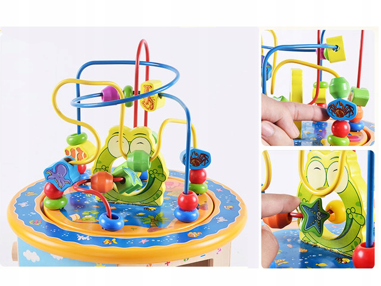 Одна сторона — це сортувальник блоків (коло, квадрат, трикутник і п’ятикутник), інша сторона містить кольорову рахівницю.
