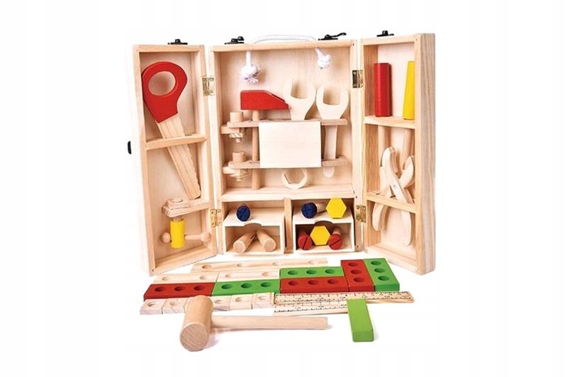 Дерев'яний ящик з інструментами. Функції: коробка закривається, елементи з'єднуються через отвори і гвинти.