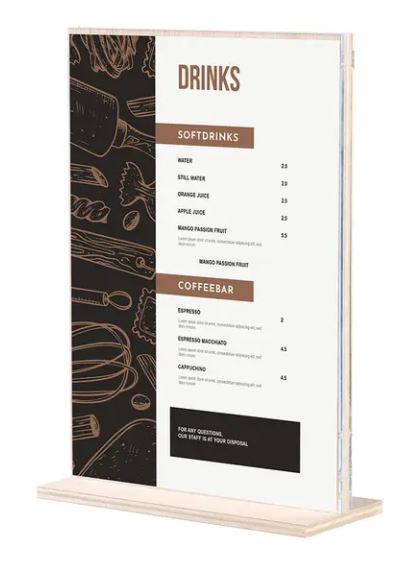 Ідеально підходить для портретних вставок формату A4 і пропонує стильний варіант презентації для широкого діапазону вмісту. Підставка має надзвичайно стійку конструкцію. Це дозволяє оптимально подавати інформацію, рекламні повідомлення або картки меню. У той же час ви можете скористатися перевагами екологічно чистого матеріалу. Т-подібна дерев'яна підставка "Junus2" є ідеальним вибором для привабливої та екологічної презентації.