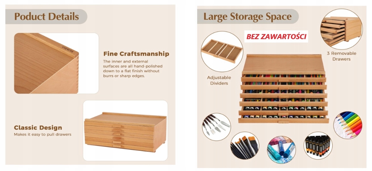 - Дерев’яна коробка для зберігання виготовлена з високоякісної німецької букової деревини, яка міцна і довговічна. Всі ящики для художніх приладдя підходять і їх можна легко вставити та вилучити. Усі внутрішні та зовнішні поверхні розкладені вручну і не мають задирок або гострих країв. Не тільки вишуканий дерев’яний коробка для зберігання художніх матеріалів має гарний вигляд, але й внутрішні деталі.