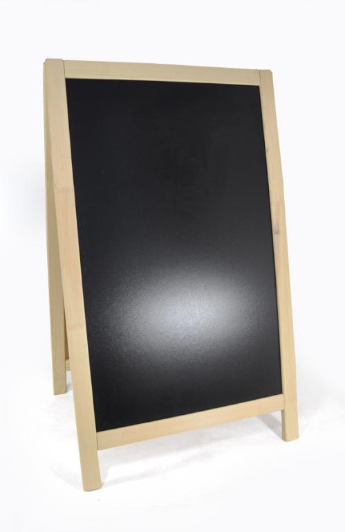 Двостороння рекламна вивіска виготовлена з HDF плити, яка виконує функцію крейдяної дошки, та дерев'яного каркаса. Стопор має ланцюжок, який перешкоджає його розгортанню.