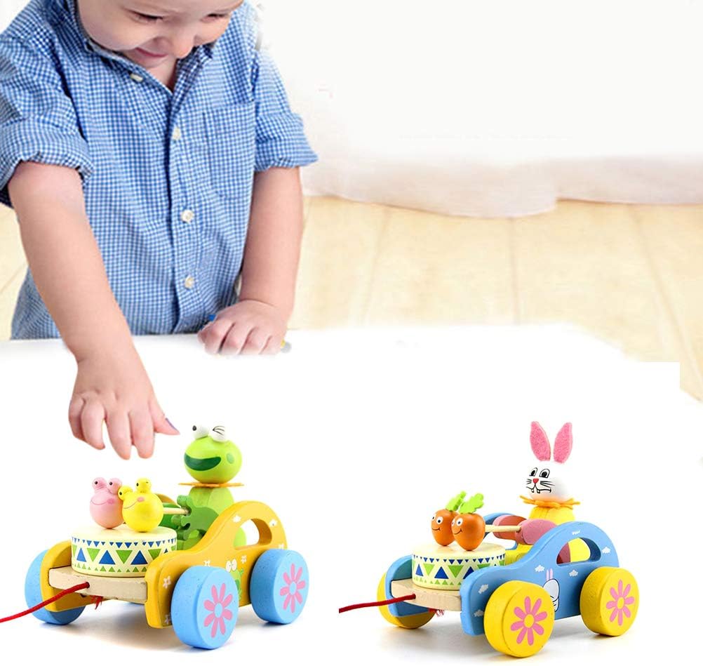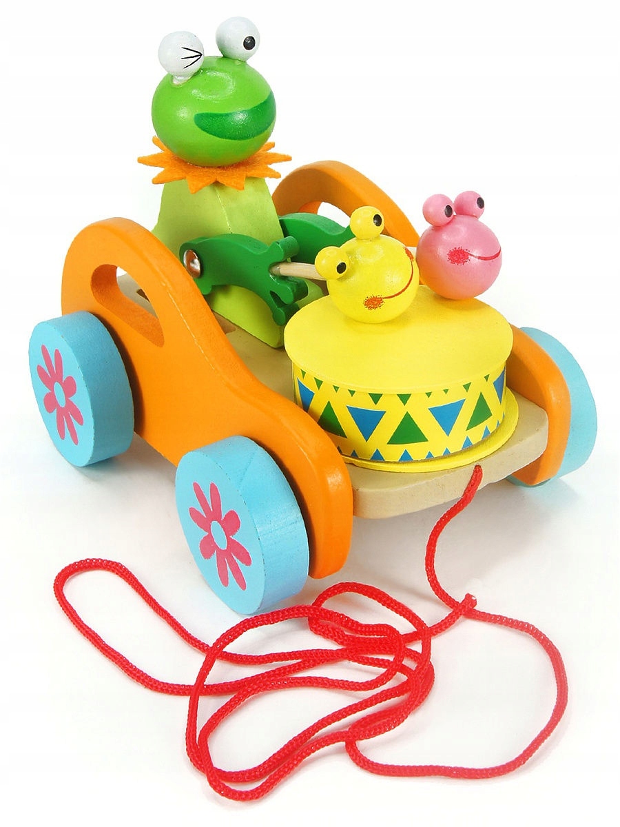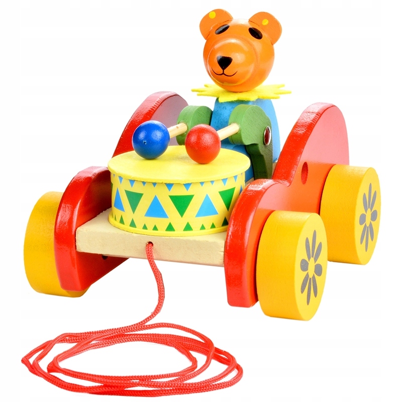 Барвиста дерев'яна іграшка у вигляді звірят, що сидять на машині - ведмедик, жаба, кролик. Має 4 коліщатка та мотузку, за допомогою якої ви приводить іграшку в рух. Крім того, спеціальний механізм рухає руками ведмедика, одночасно вдаряючи по барабану.