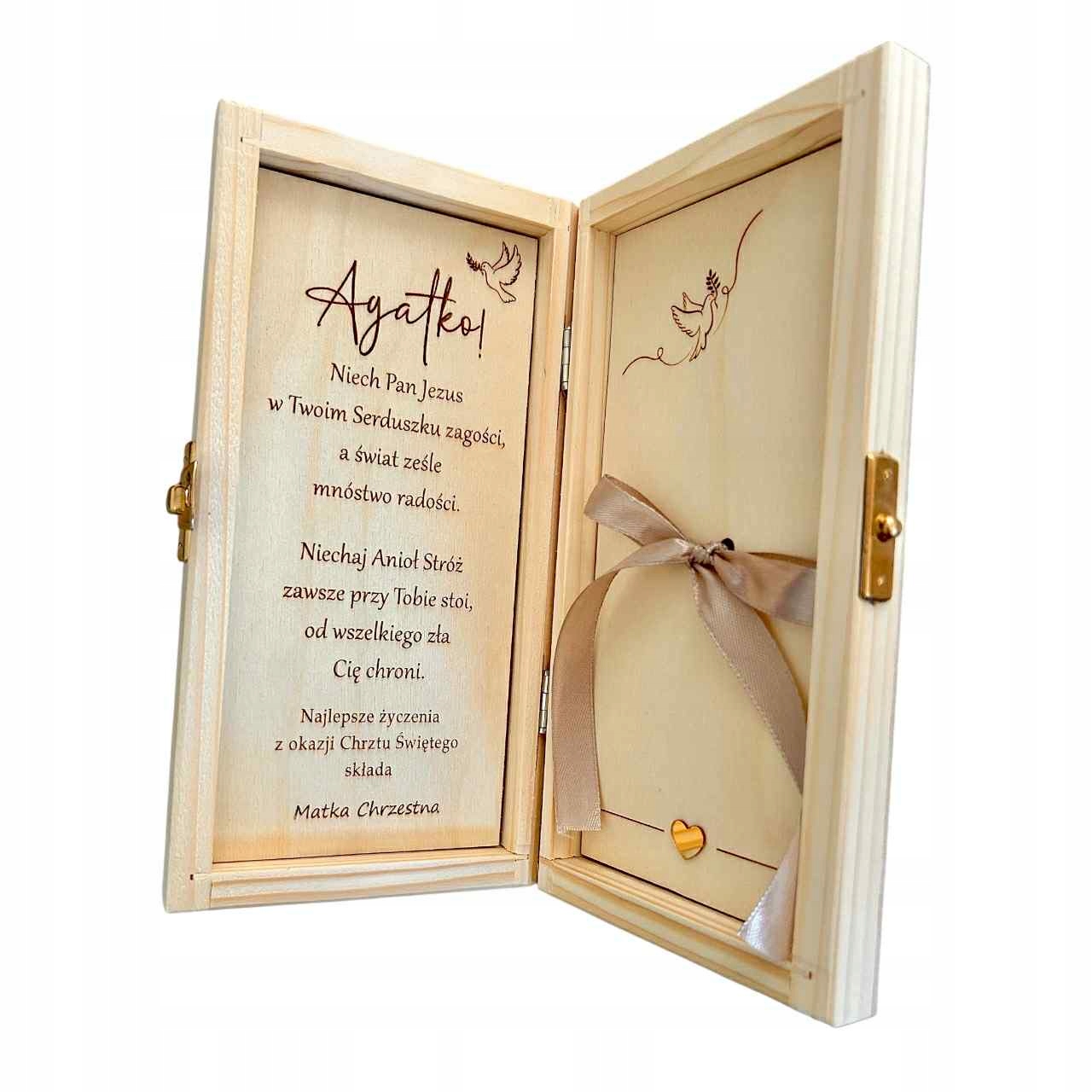 Красива дерев’яна персональна коробка з ім’ям дитини та присвятою від того, хто її дарує.