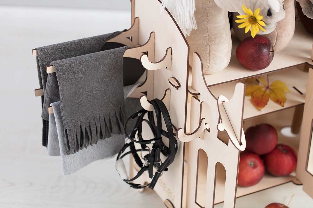 Ми створюємо екологічні, безпечні для здоров’я та екологічно чисті продукти. З думкою про дітей всі стійкі елементи, включаючи гачки, заокруглені. Стайня виготовлена ​​з фанери натурального кольору і створює чудову основу для фарбування, декорування та надання індивідуального характеру.