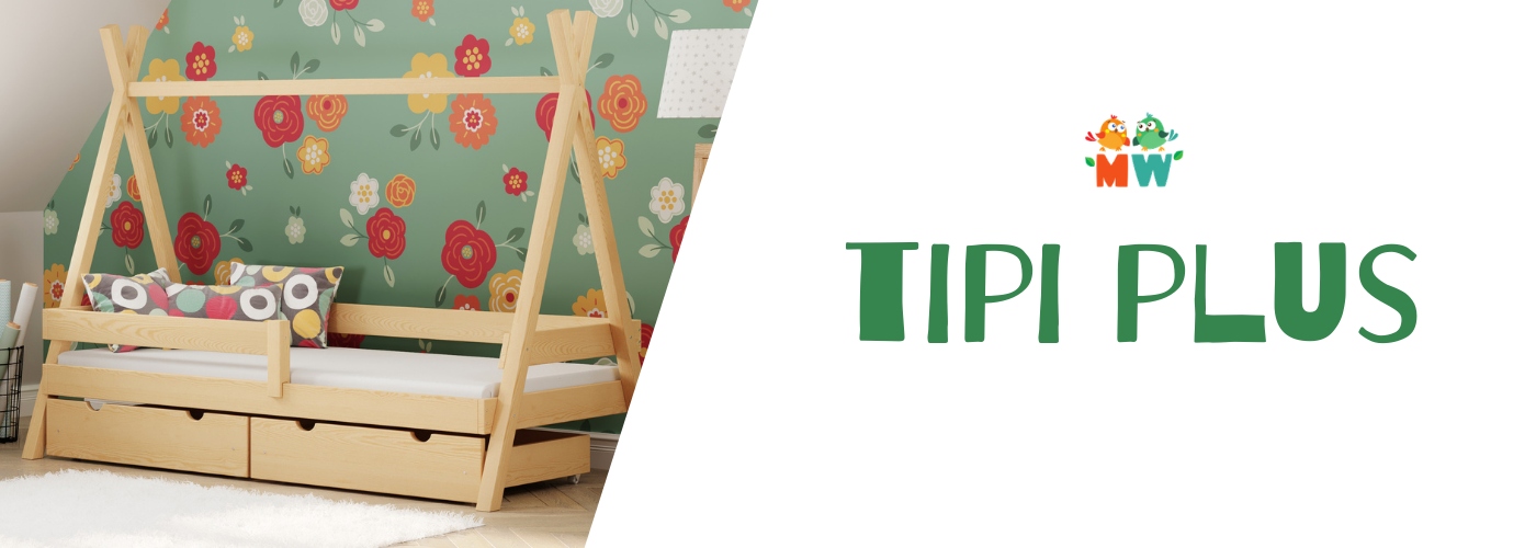 З TIPI PLUSнемає часу нудьгувати! Представлена модель являє собою односпальне дитяче ліжко, повністю виготовлене з сосни. Це унікальне ліжко можна оснастити ящиком для зберігання постільної білизни, книг або ігор під ліжком. Його дизайн відсилає до вігваму, заохочуючи веселощі в індійському стилі. Дизайн дозволяє прикрасити його аксесуарами, які персоналізують образ і зроблять його унікальним. TIPI PLUS заохочує вас дати волю своїй уяві!