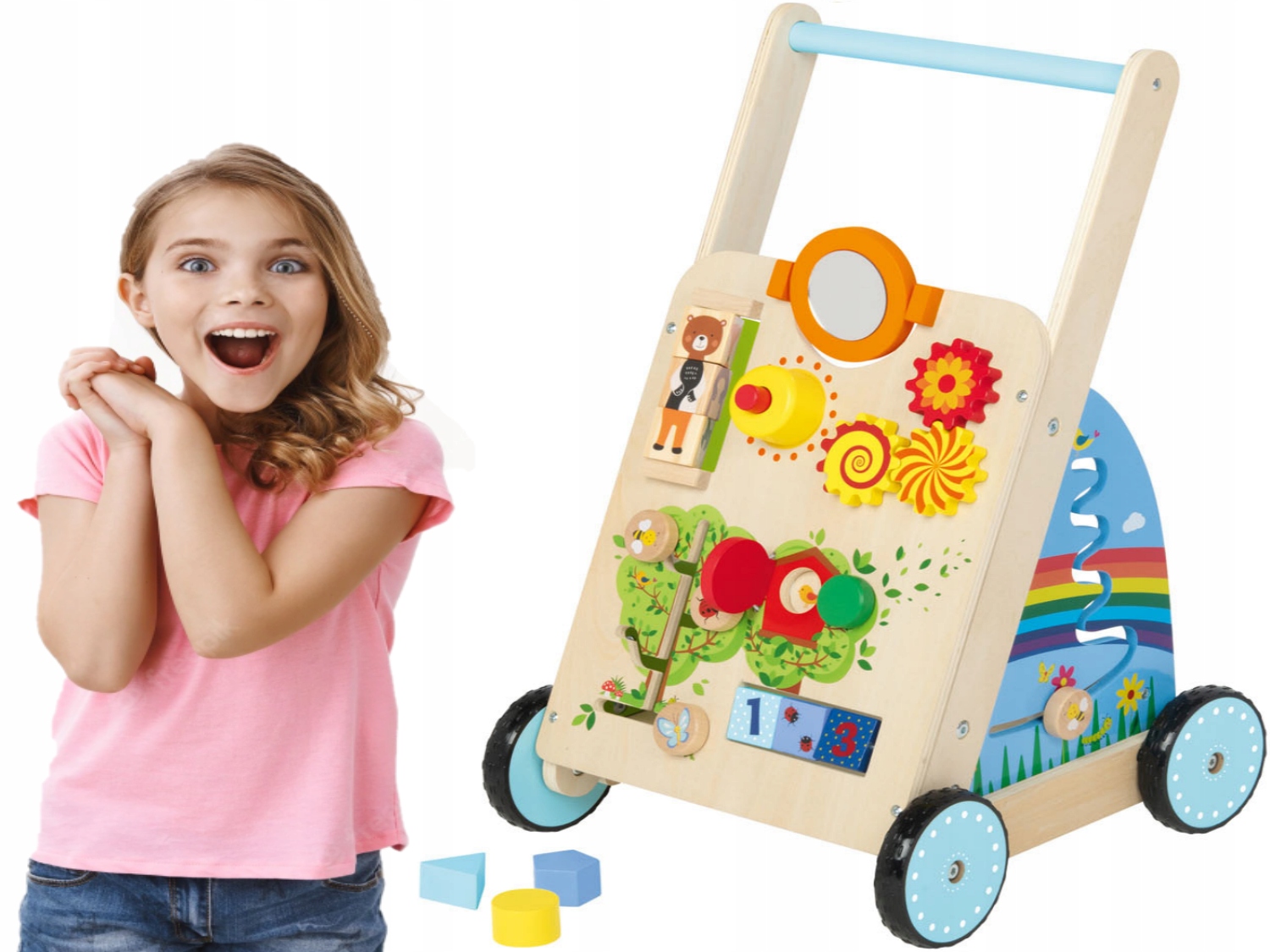 - ШТУКАЧКА З РУЧКОЮ - штовхалка полегшує навчання ходьбі та утримання правильної постави, водночас заохочує дитину робити перші кроки самостійно