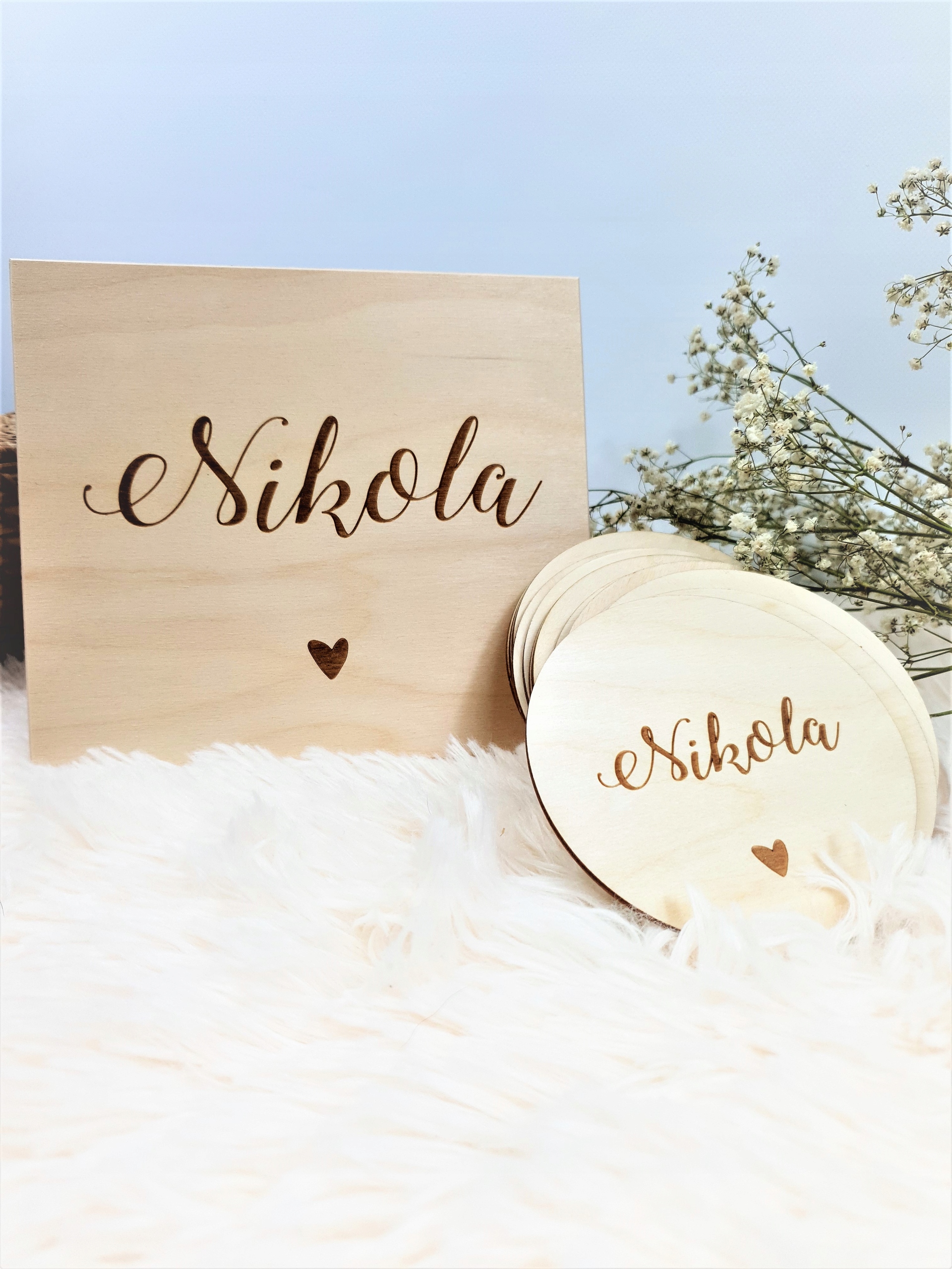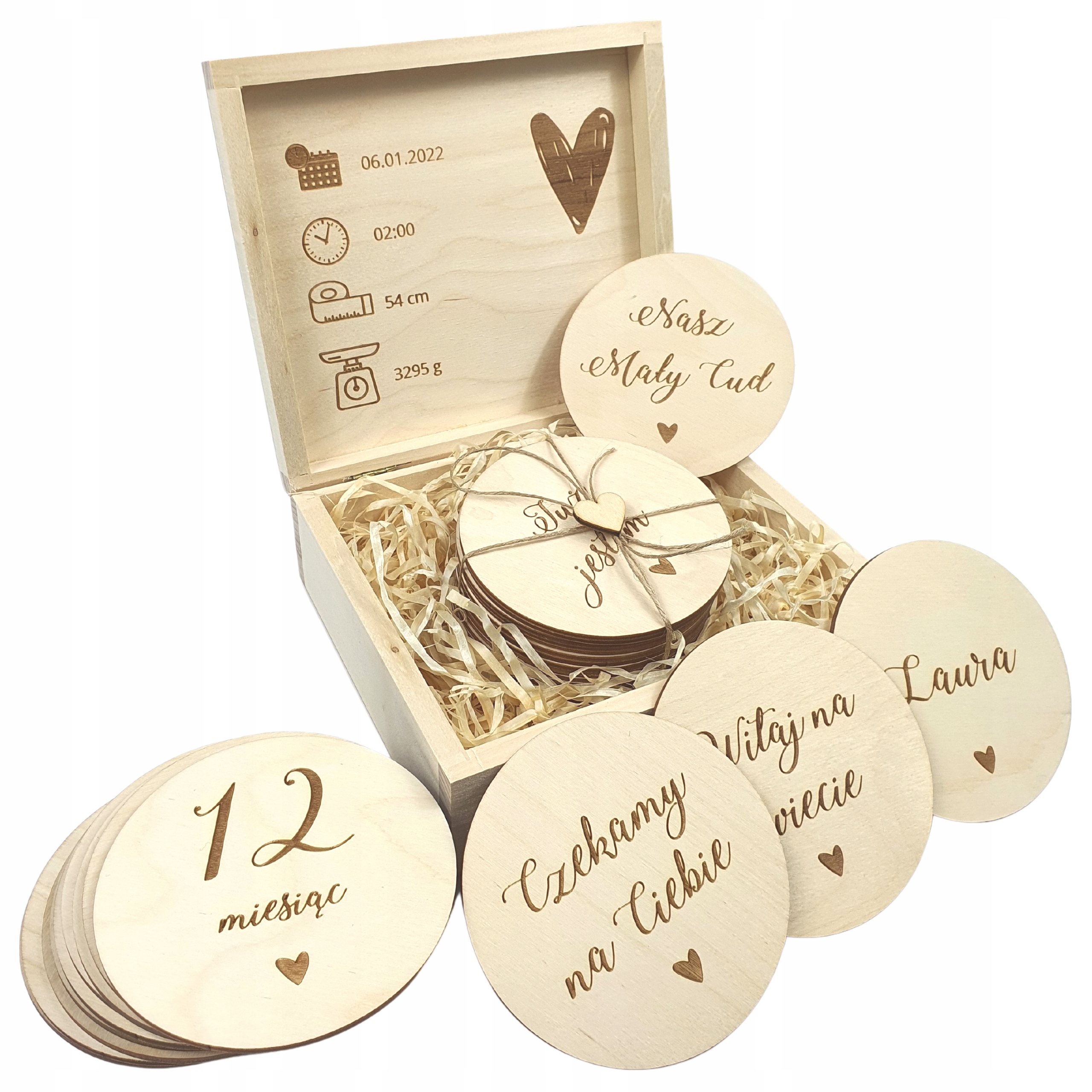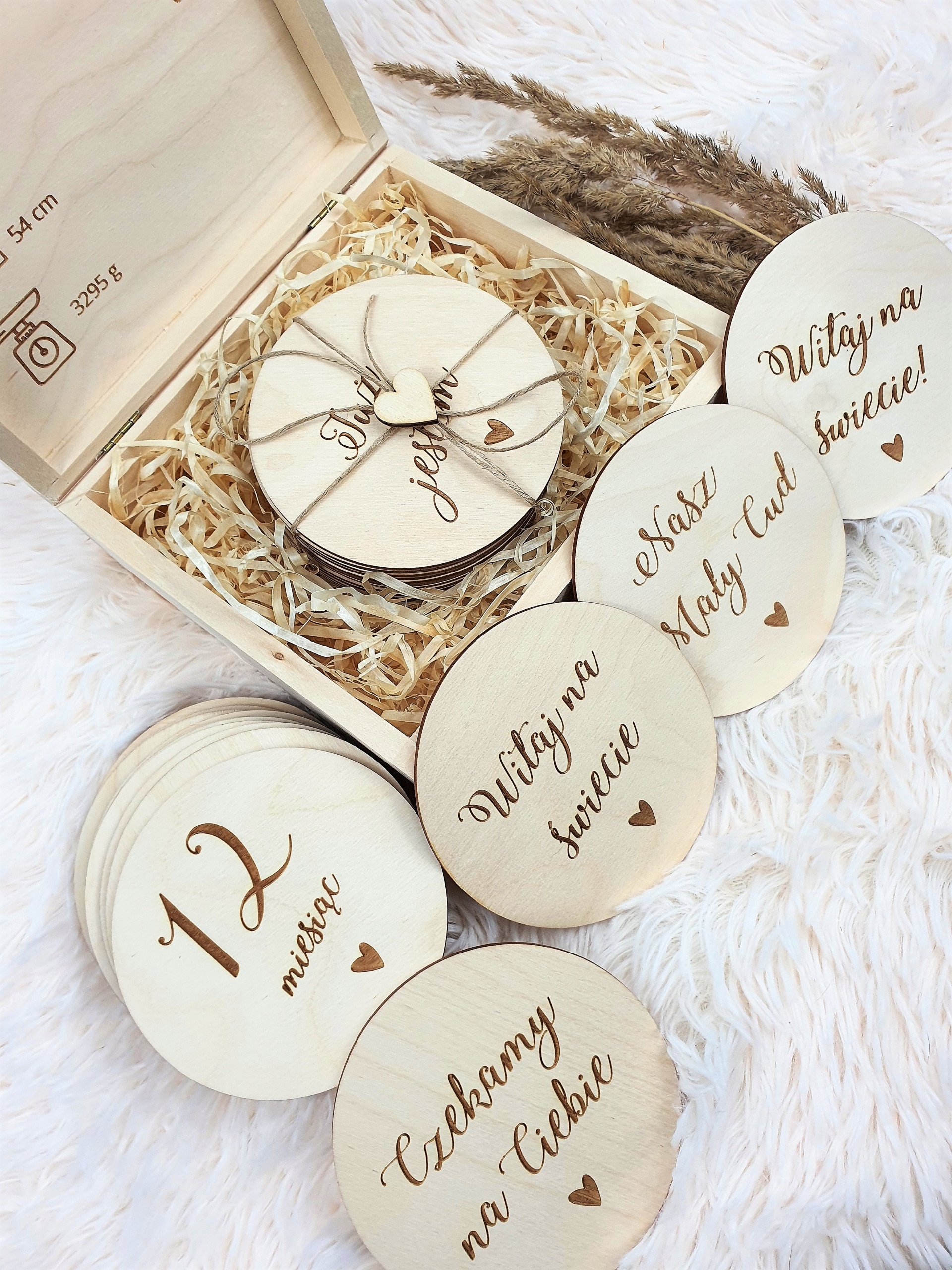 Унікальні персональні таблички, упаковані в коробку із золотою застібкою . Вони є ідеальним способом увічнити перші 12 місяців вашої дитини.