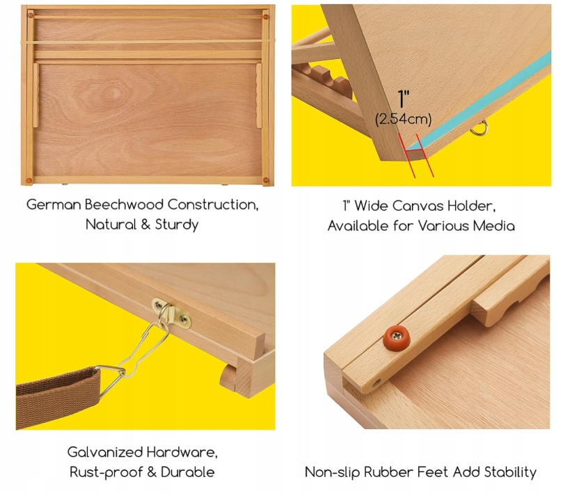 - Цей мольберт є легким, але довговічним. Для стабілізації мольберта використовуються рука з приправленої букової деревини та закінчена натуральною олією. Дереви дерева гладкі і блискучі. Ми також додали еластичну смугу та плечовий ремінь, щоб мольберт був закритим та портативним між використанням. 4 Це відмінний постріл для серйозної подорожі або ескізу в студії.