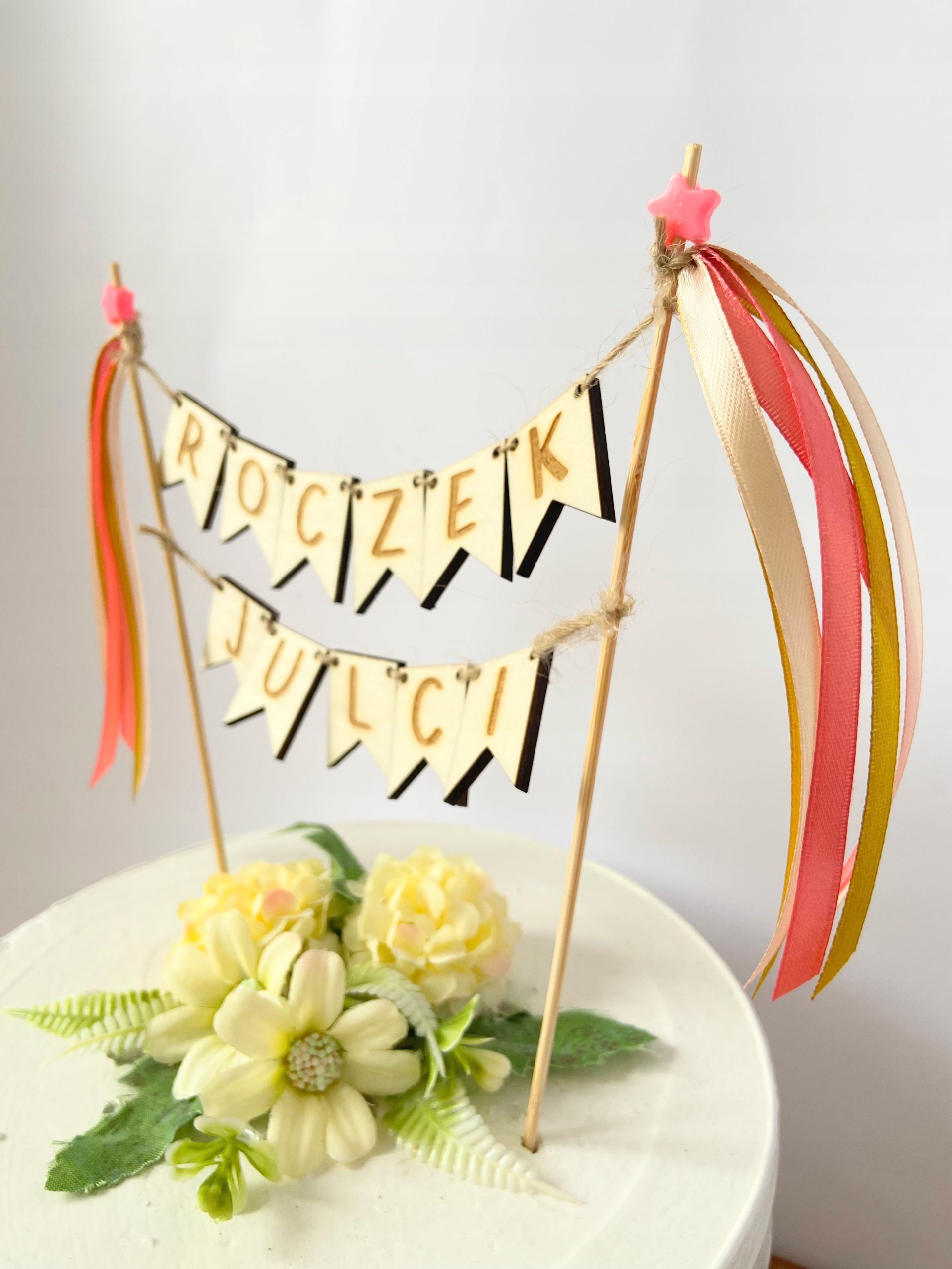 Топпер з власним написом. Напис виконано дерев'яними прапорцями, підвішеними на джутову нитку. З боків стрічки коралового, золотого та бежевого кольорів та рожеві зірочки. Ми можемо зробити на ньому будь-який напис із двох слів :)