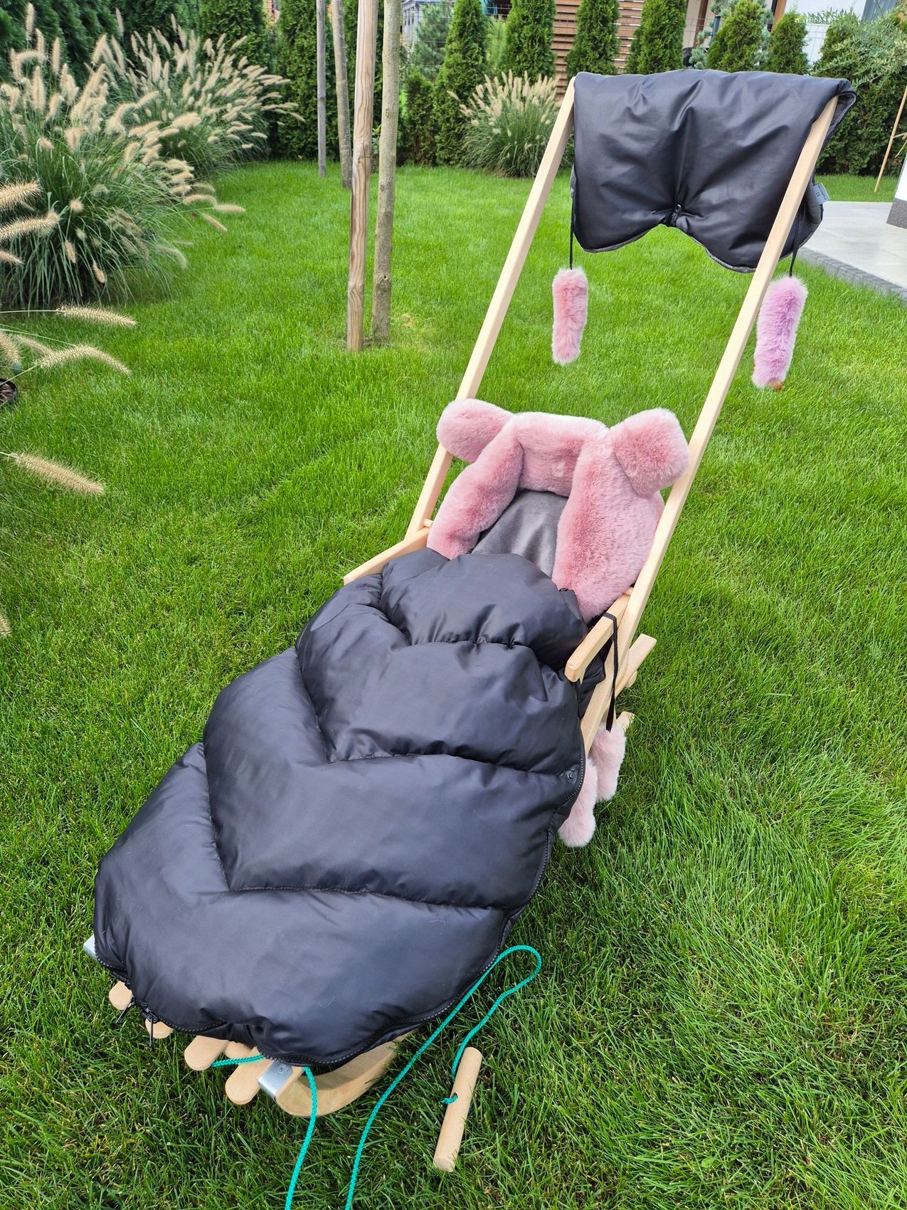 дерев’яні сани з спинкою, натисканням ручки та струни, щоб витягнути спальним мішком та муфтами