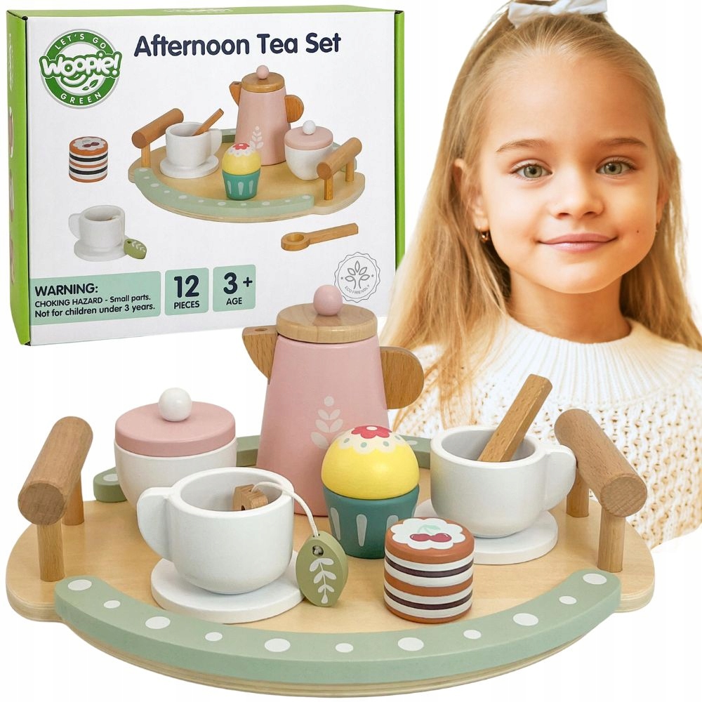 Запрошуємо на післяобідній чай! Цей чарівний дерев'яний чайний набір від Woopie Green - справжня перлина серед рольових іграшок. Завдяки пастельним кольорам у відтінках пудрово-рожевого, ніжного зеленого та натурального дерева кожна вечірка перетворюється на елегантну чайну церемонію. Дитина може виступити в ролі господаря, подаючи своїм гостям - батькам, братам і сестрам або улюбленим м'яким іграшкам - ароматний чай з глечика з красивою листочкою, смачні кекси і вишукане печиво. Набір із високоякісної деревини з безпечною нетоксичною обробкою є гарантією тривалого задоволення, повного фантазії.