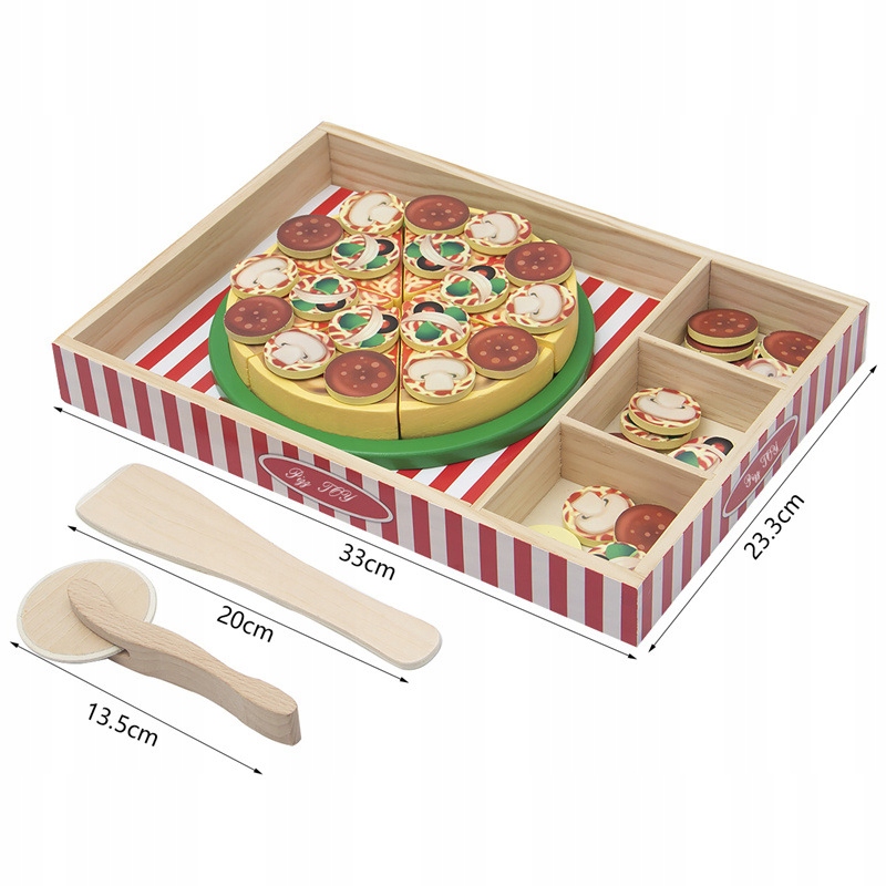 Дерев'яна піца - продукт для справжніх шанувальників італійської кухні! Усі діти люблять піцу, тепер вони можуть стати справжніми босами! Піца вражає своєю майстерністю! Окремі елементи оснащені липучками для полегшення маніпуляцій та створення власних смакових композицій! Відтепер кожен фанат піци тренуватиме моторику, причинно-наслідкове мислення, координацію рук і очей і логіку через гру!