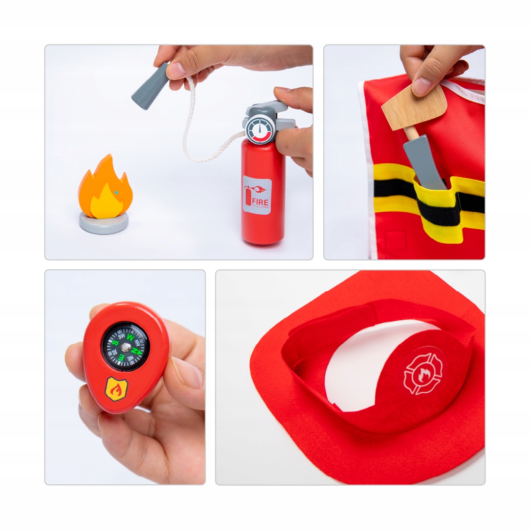 До дерев'яного пожежного набору входять: каска пожежного, костюм пожежного, вогнегасник, пожежний кран, радіостанція, лопата, сокира, мегафон, запобіжний конус, манекен вогню, значок пожежника, свисток, компас і ліхтарик.