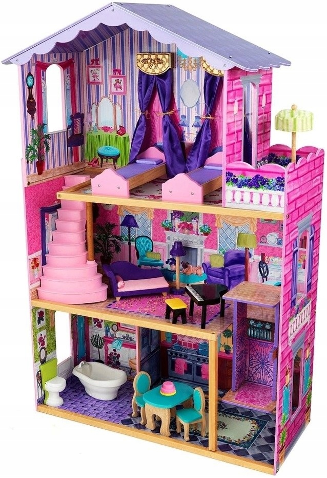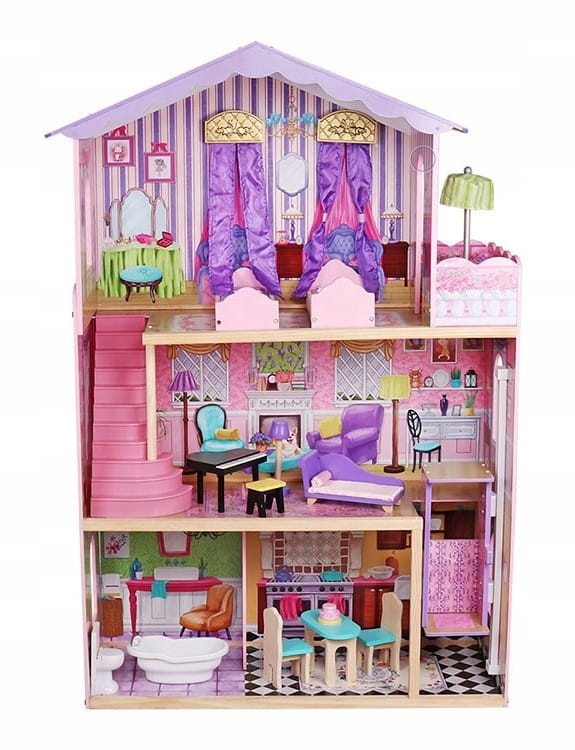 Цей гарний трирівневий дерев'яний будинок повністю обладнаний, а його просторі кімнати означають, що дитина зможе безперешкодно грати, переставляти меблі та облаштовувати кожну кімнату з нуля. Будь-яка лялька Барбі та всі менші ляльки можуть жити в будинку.