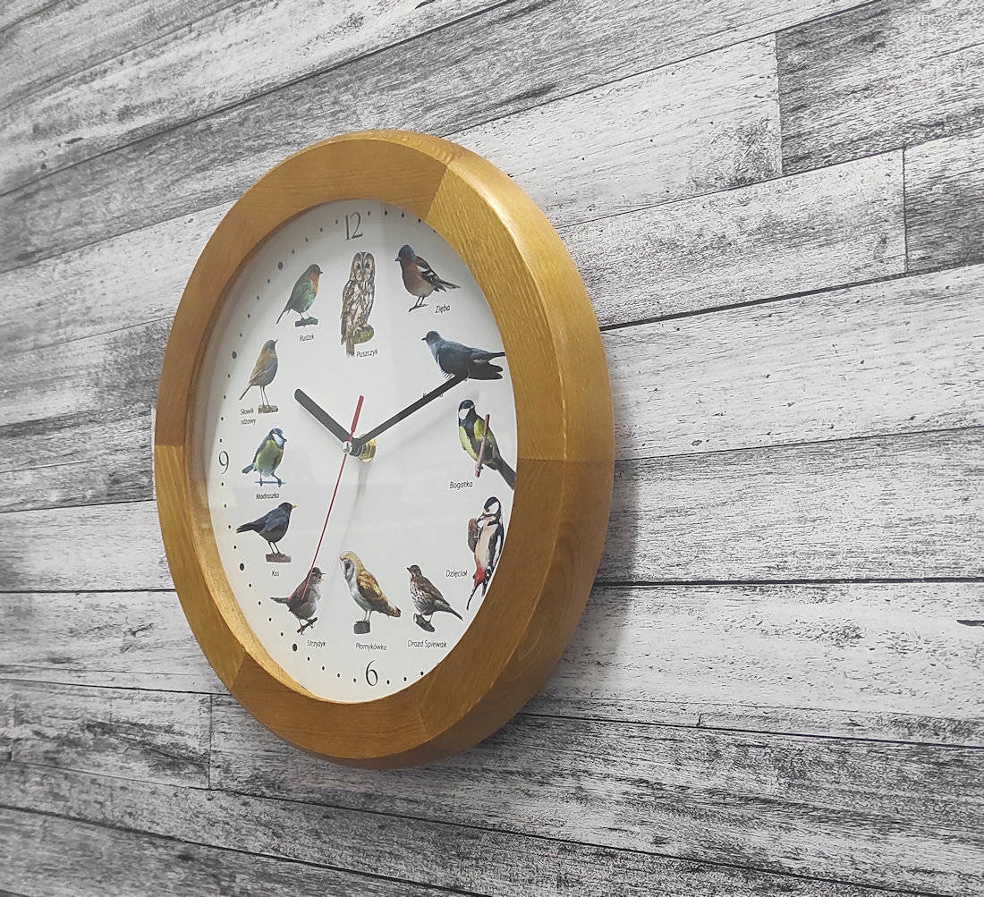 Яскравий дерев'яний настінний годинник від Atrix із механізмом дзвінка - голоси 12 птахів. Кварцовий механізм. Діаметр 30 см
