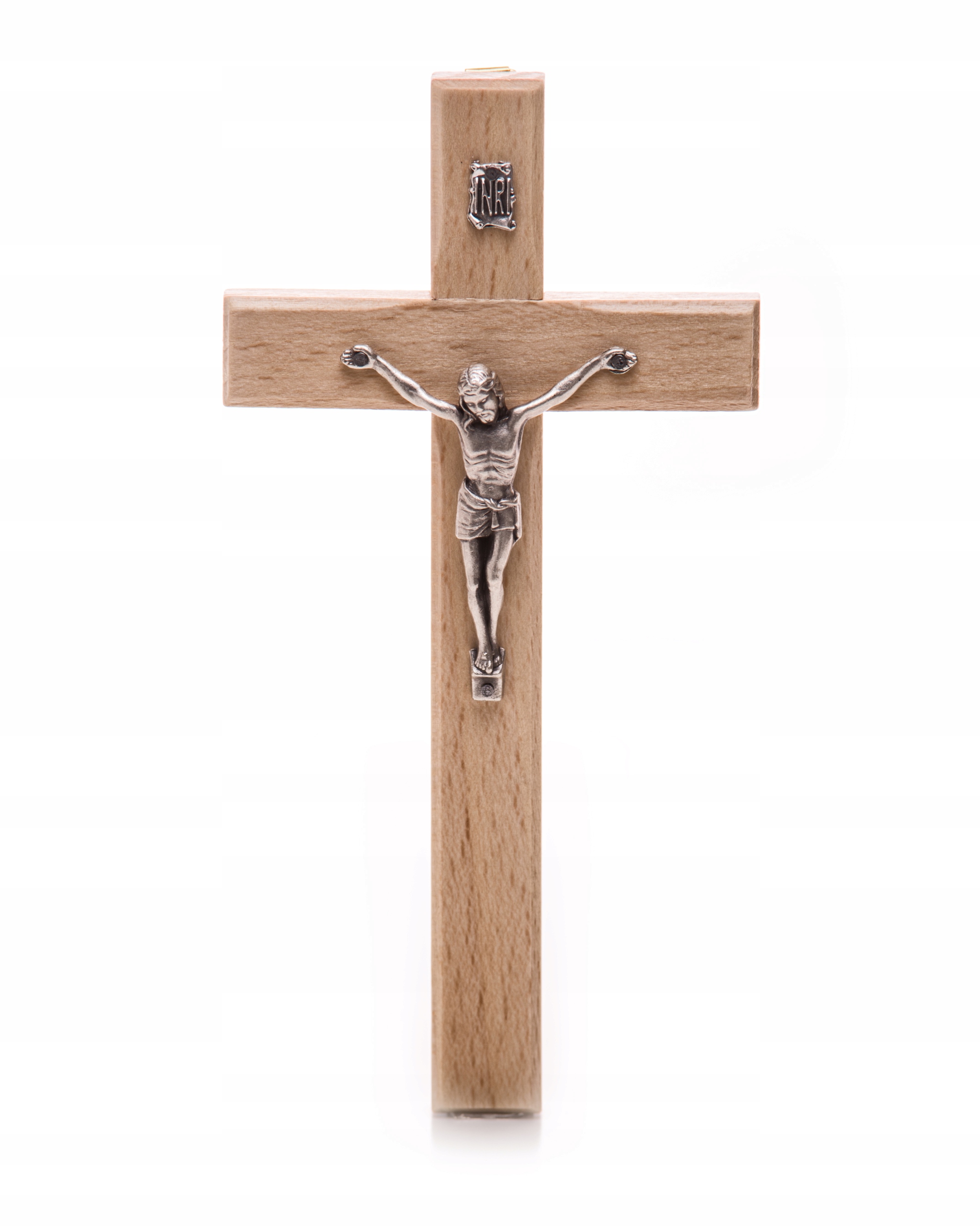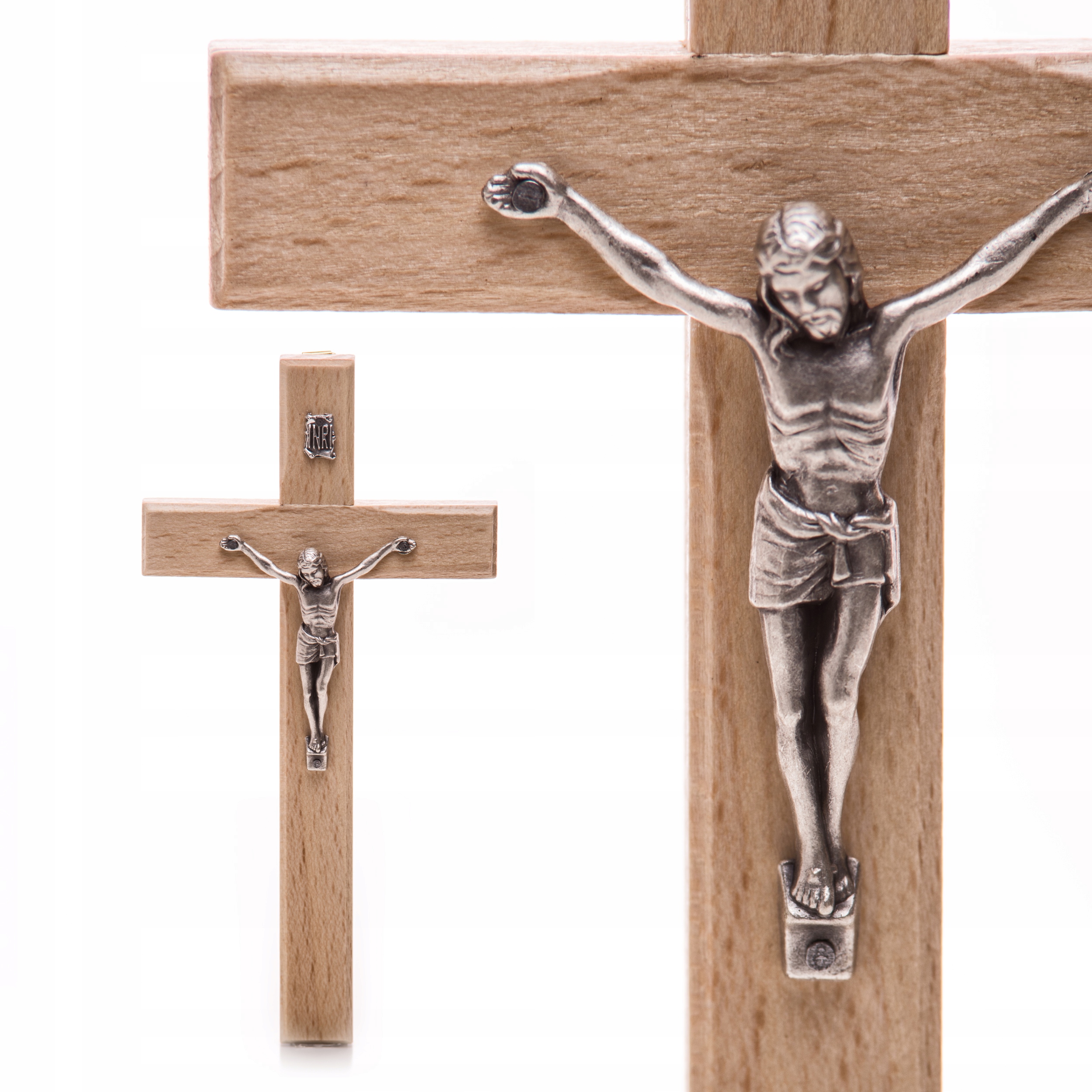 ручний стінний хрест, виготовлений з деревини простої елегантної конструкції. Натуральна деревина підходить для підлоги нагрівання та елегантного вигляду. Центральним елементом є металева фігура Ісуса Христа, естетично відтворена реалістично, що підкреслює духовний вимір хреста. У верхній частині хреста є металевий напис "inri", традиційний символ, що посилається на розп'яття Ісуса