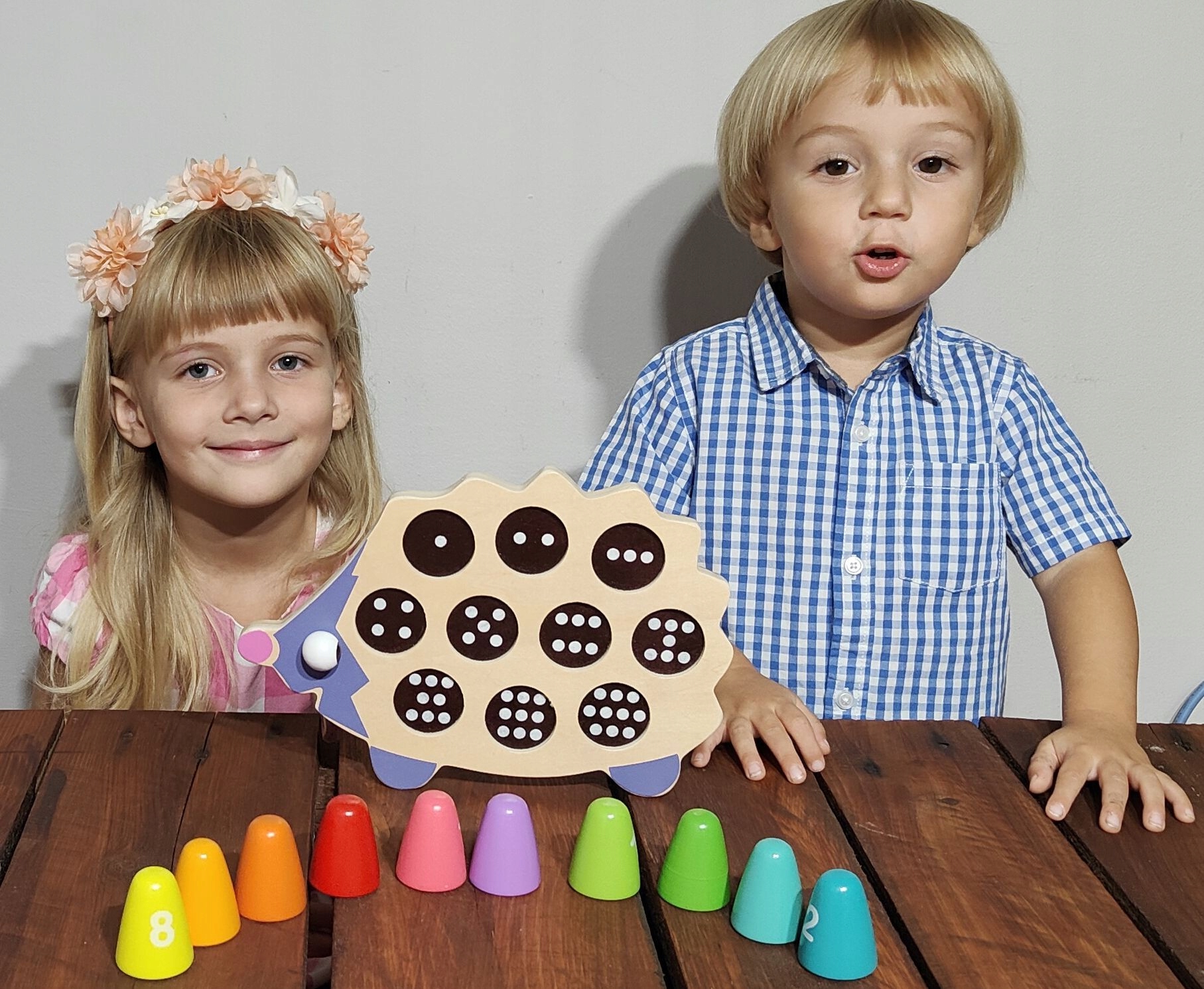 Навчальна іграшка, яка стимулює та стимулює розвиток дитини. Іграшка розвиває творчість, ручні навички, загострює почуття концентрації, вчить розпізнаванню кольорів та допомагає в навчальних номерах. Гра передбачає відповідність чисел, зроблених з кольорових елементів, до кількості крапок на основі. Номери навчання підтримуються вибором кольорів на блоках, що утворюють веселку. Головоломка складається з основи та 10 різних кольорових шматочків. Іграшка виготовлена з найвищої якості матеріалів і намальована фарбами на водній основі, що робить її безпечною для дитини.