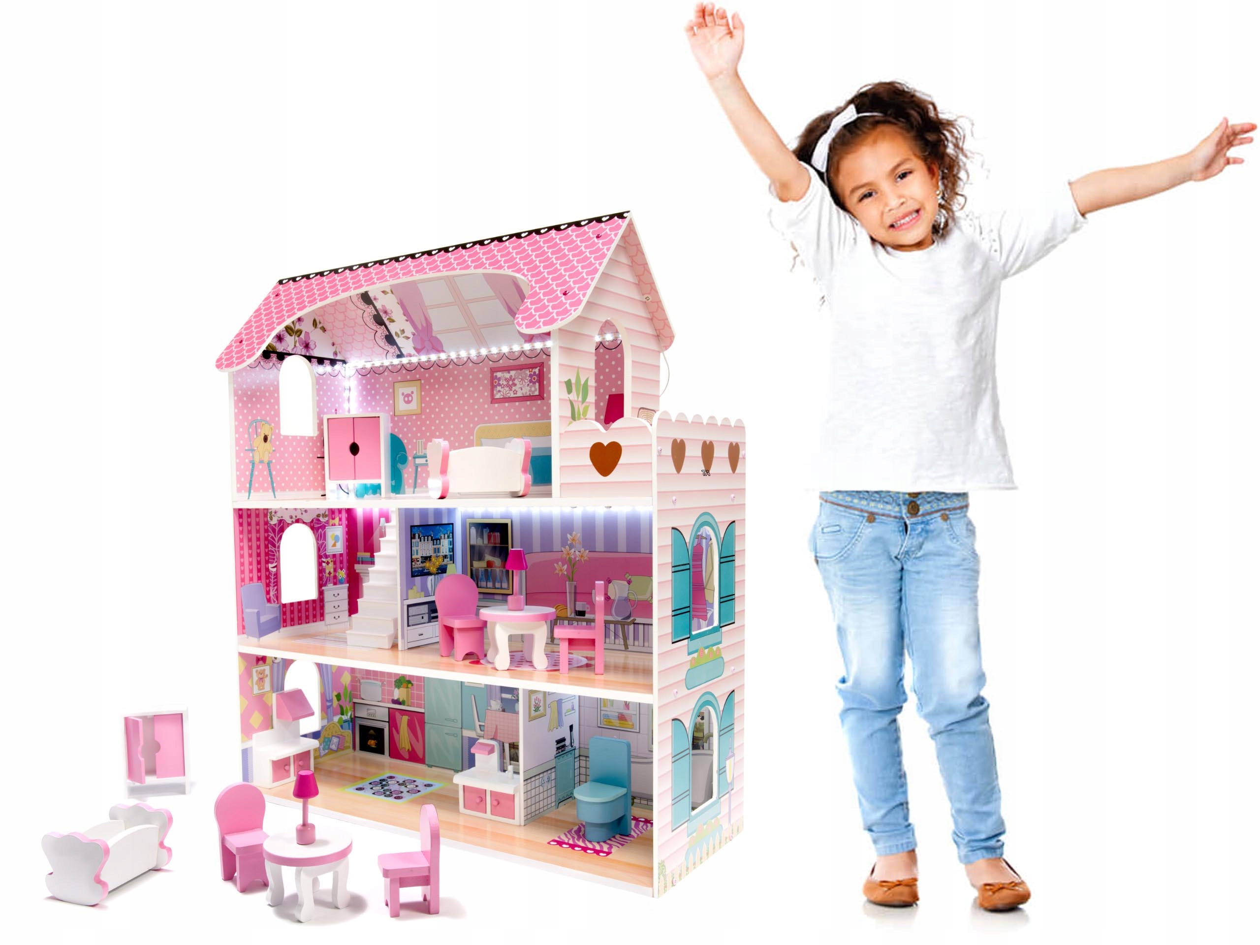 Дерев'яний ляльковий будинок з світлодіодним освітленням XXL великі 70 см рожеві меблі