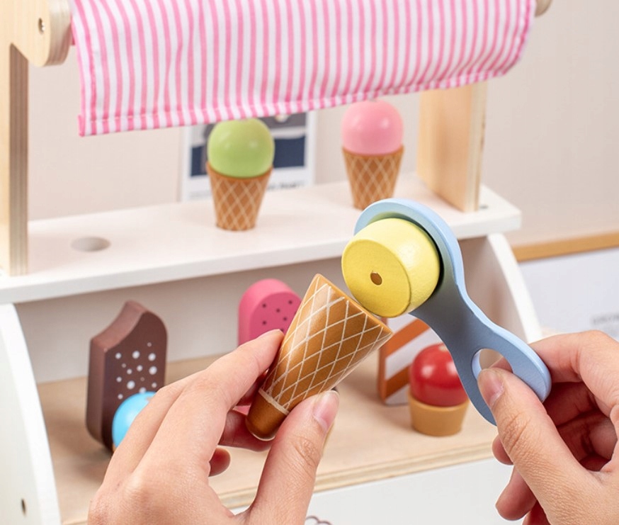 Wooden Ice Cream Parlor створений для справжніх любителів морозива! Це ідеальна іграшка, яка поєднує в собі безтурботну гру з навчанням і розвитком. Завдяки безлічі елементів дитина може створити безліч смаків смачного морозива! Багато дітей неодмінно оцінять її під час зустрічі з друзями чи гри в кафе-морозиво, кондитерську чи будинок.Іграшка сприяє розвитку уяви, моторики та логічного мислення. Естетична, дерев'яна Підставка з дахом полегшує зберігання та демонстрацію смачних комбінацій морозива вашої дитини.