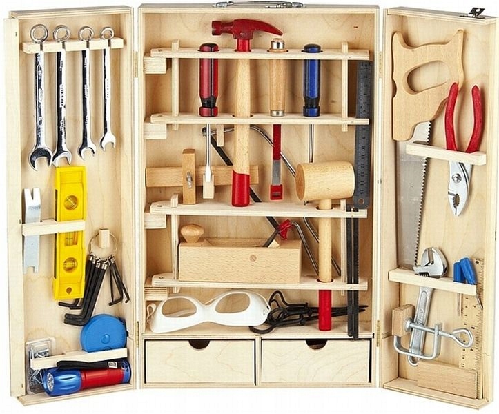 - Велика дерев’яна коробка, наповнена інструментами та необхідними аксесуарами.