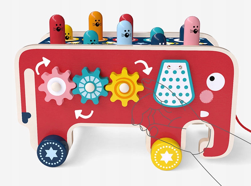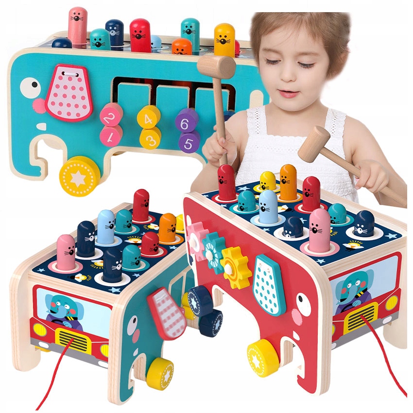 ➡️Пробивати ховрахів: На верхівці слона, в отворах, є різнокольорові ховрахи. Деякі з них приховані, а інші стирчать. Постукайте по ховраху молотком із набору, і він сховається всередині. В ту ж мить з іншого отвору визирне ще один. Нескінченна розвага ;)